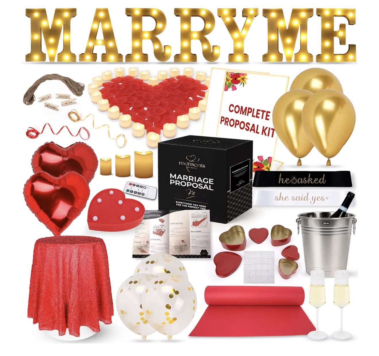 Moments by KEFF Complete Marriage Proposal Kit – All-in-One Engagement Decorations Set with LED Marquee MARRY ME Letters, Petals, Flameless Candles, Carpet, Champagne Glasses, Setup Brochure & More