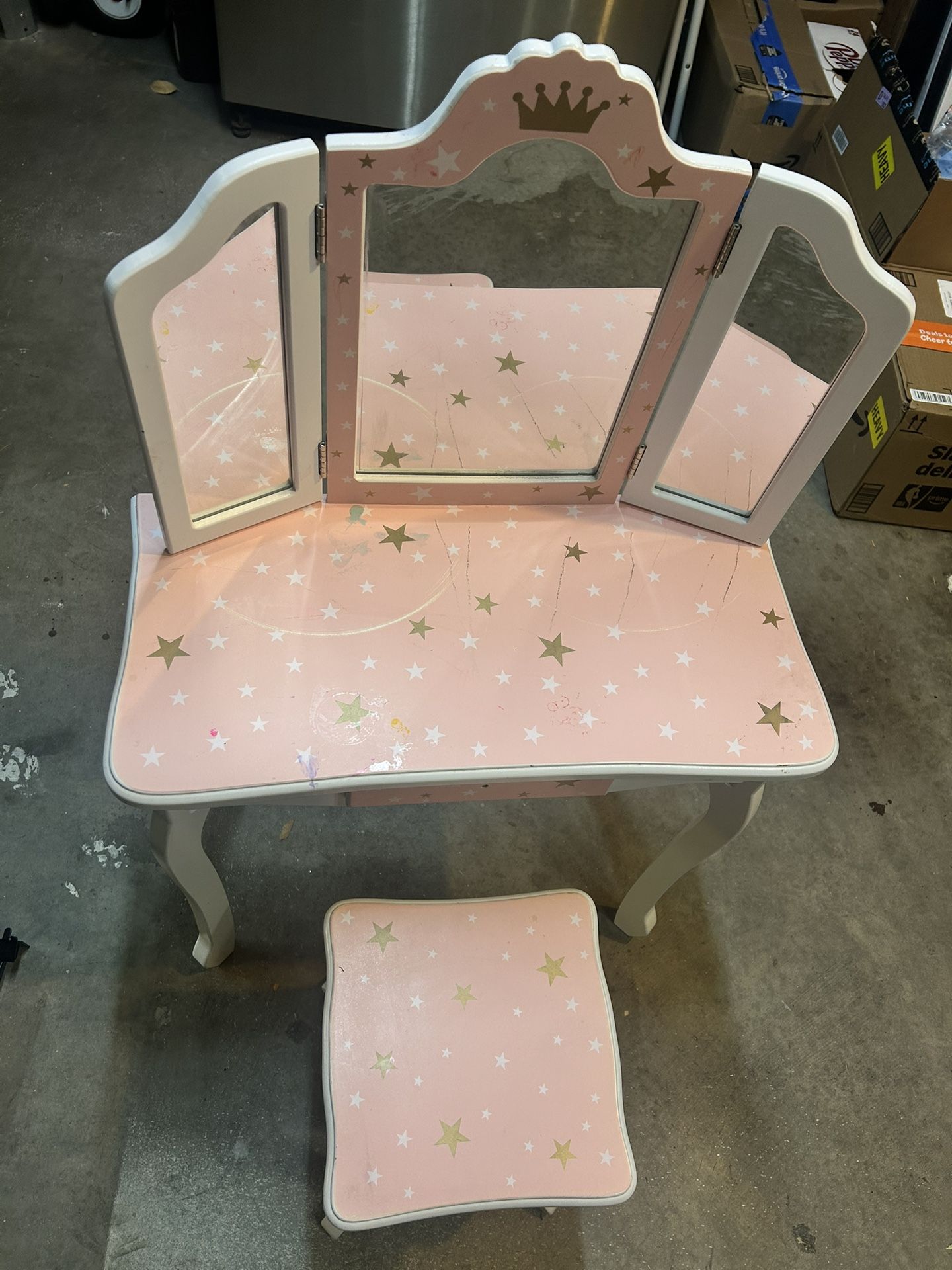 Small, used vanity. It is missing the knob for the drawer, but it still opens without it. Has small nail polish stains and crayon on it. I paid $80 on Amazon about a year ago for it.