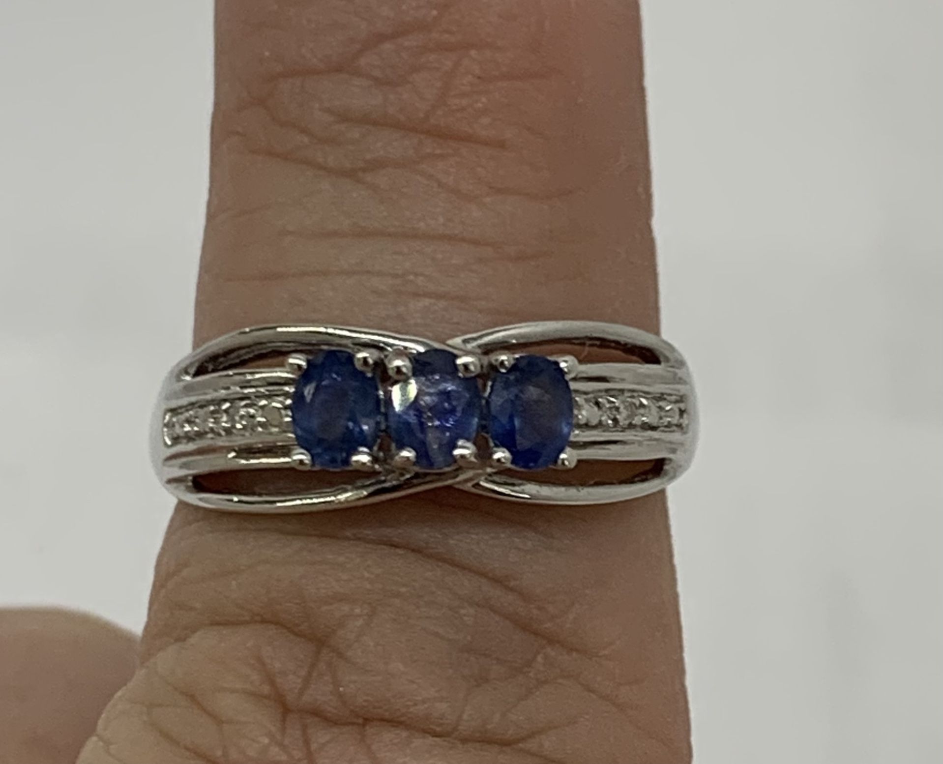 Real 10kt white gold with 3 oval sapphire stones and diamond accents. Size 7. Ring can be sized.