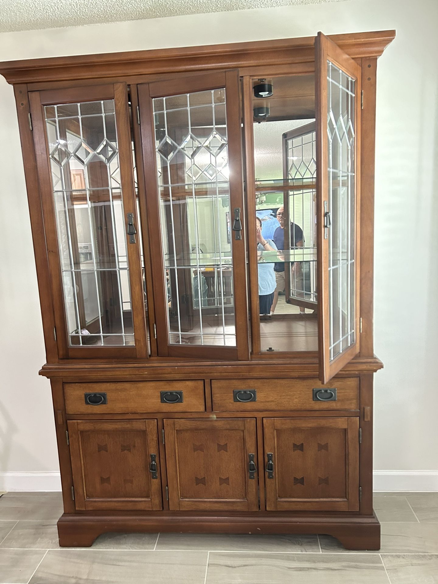 Two felted draws, three doors on bottom with plenty shelf storage. The style is shaker style. Two glass shelves a total of three shelves in hutch for storage. Three glass doors with nickel finish design.