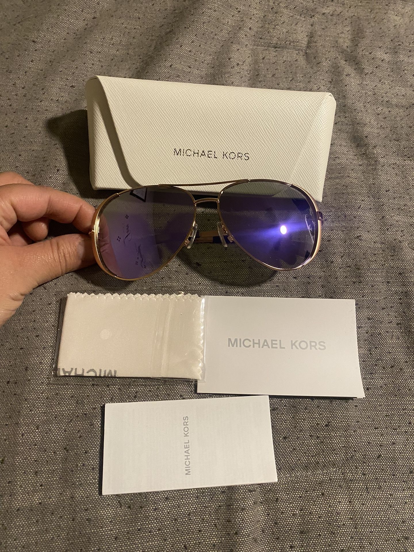 READ ALL!! Brand new Authentic Michael Kors Aviator style sunglasses. Rose gold metal frame with golden purple mirror lenses. Comes with case, sealed cleaning cloth, and two booklets of authenticity. Never worn only taken out of case for Pictures. Retails for $99 still has sales tag. Open to offers but no low balling. PICK UP ONLY NO HOLDS OR TRADES SERIOUS BUYERS ONLY