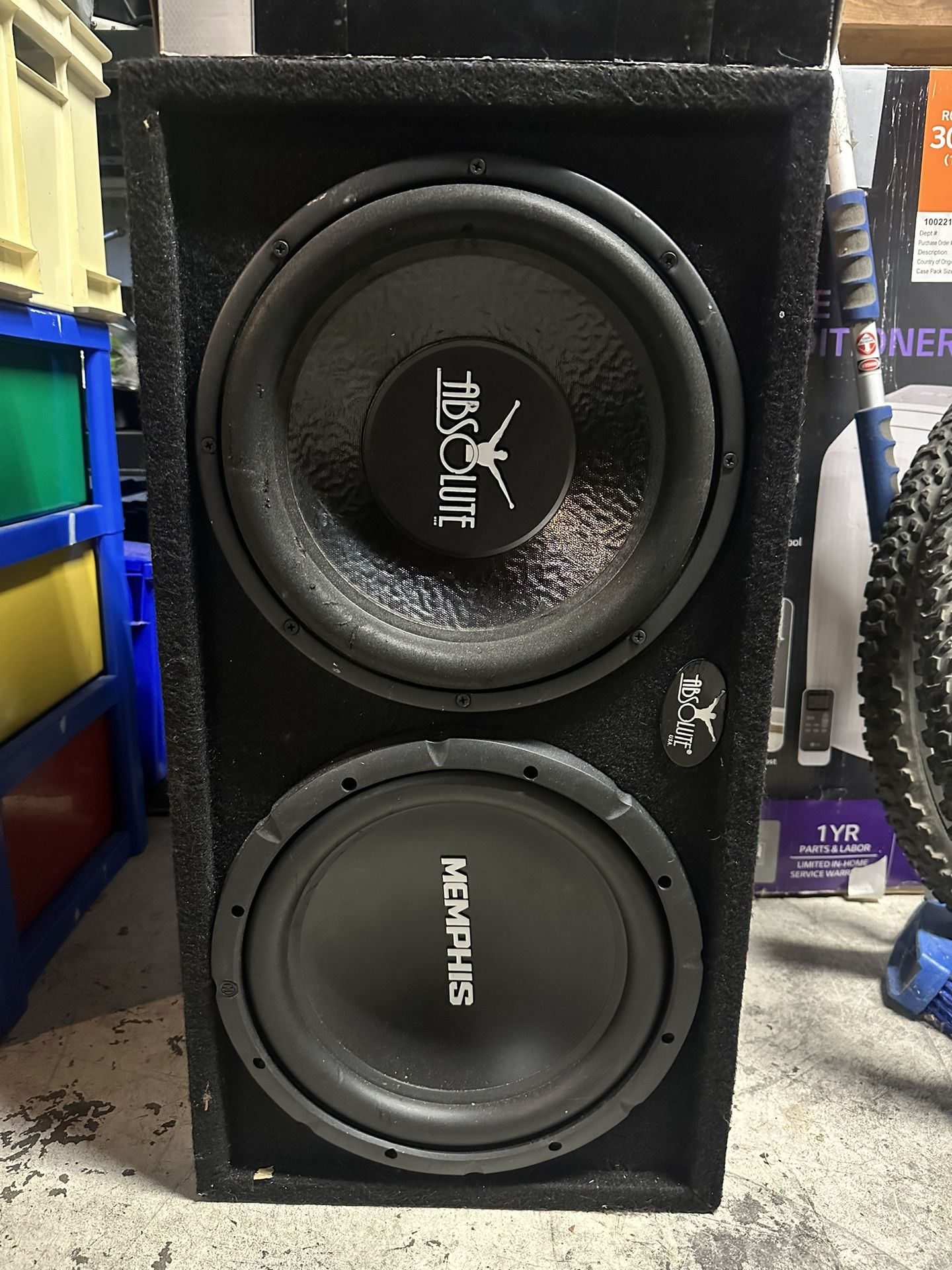 Rockford Fosgate Amp R150x2 (Brand New) was $200. All wires & 100 Amp fuses to set up amp + Sub. Woofers are 12 inch Memphis and Absolute. Both work great. No issues.