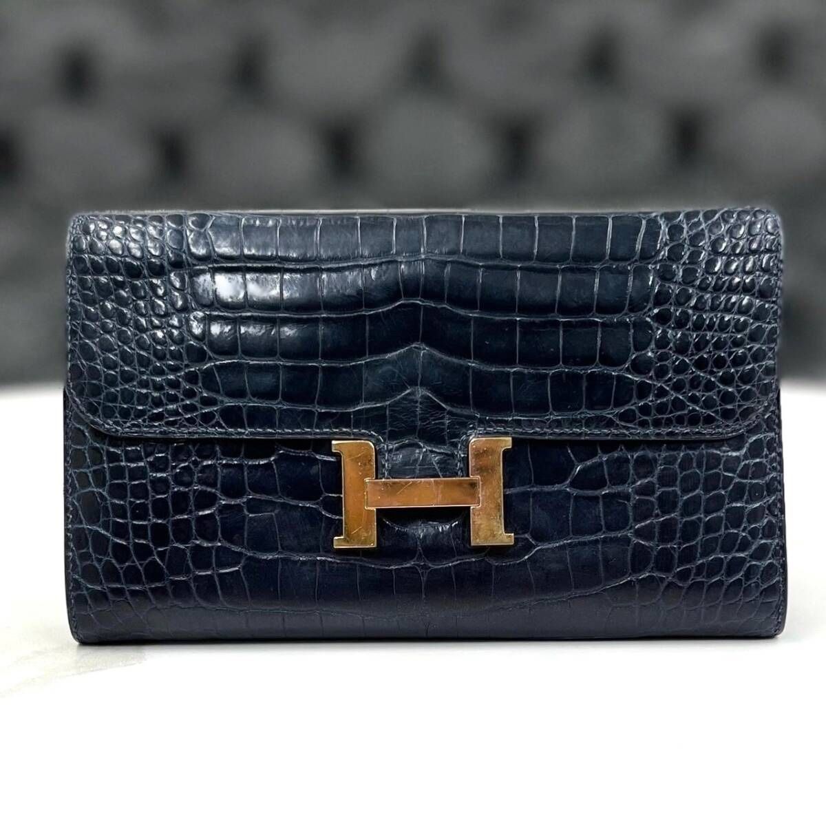 Hermes Constance Long Alligator Navy Long Wallet X Engraved 100% Authentic 〇 Condition ・ Outside has some wrinkles,Small scratches, fading, wear and tear on metal fittings ・ Inside wear and tear ・ Other notes No damage and no problem in use. Please refrain from purchasing if you are sensitive. . Please consider the fact that there is some wear and tear. 〇 Size Width 20 cm x Height 12 cm Depth 3 cm 〇 Material / Color: Alligator Gold metal fittings Navy x Brown Dark blue Brown 〇 Model: Constance Long 〇 Engraving: X Engraving 2016