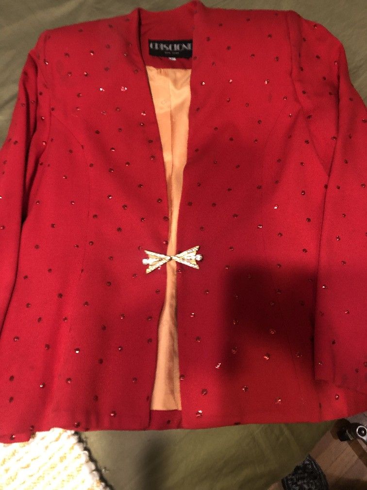 Beautiful vintage 80s women's jacket. Red with jeweled cloche waist closure and stitched red sequin accent and gold lining. Beautiful condition except a few spots on top of left shoulder hardly visible unless really close. Deal at $85