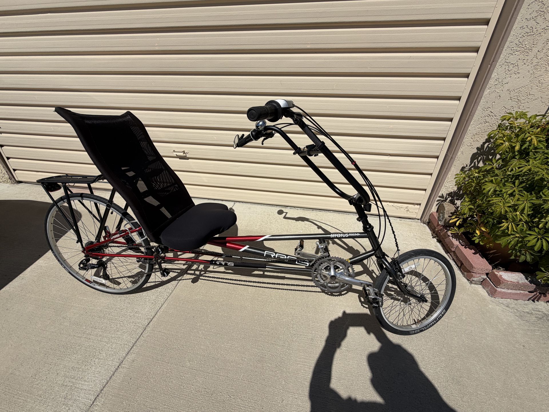 For sale: RANS Stratus700 like new red and black, 26 in rear wheel and front wheel is 20 inches. 27 speed smooth, shifting SHRAM gears. Comes with a Cat eye speedometer also comes with a rear rack with a goodie bag that turns into saddlebags when unzipped. A comfortable upright seat with storage on the back of the seat for a bike lock or accessories. There is less than 100 miles on this bike and has always been kept in the garage out of the weather.  this bike is known for going fast downhill and easy peddling on an uphill grade due to the 27 speed gears. This bicycle is a cruiser in any conditions;  lightweight for its size.