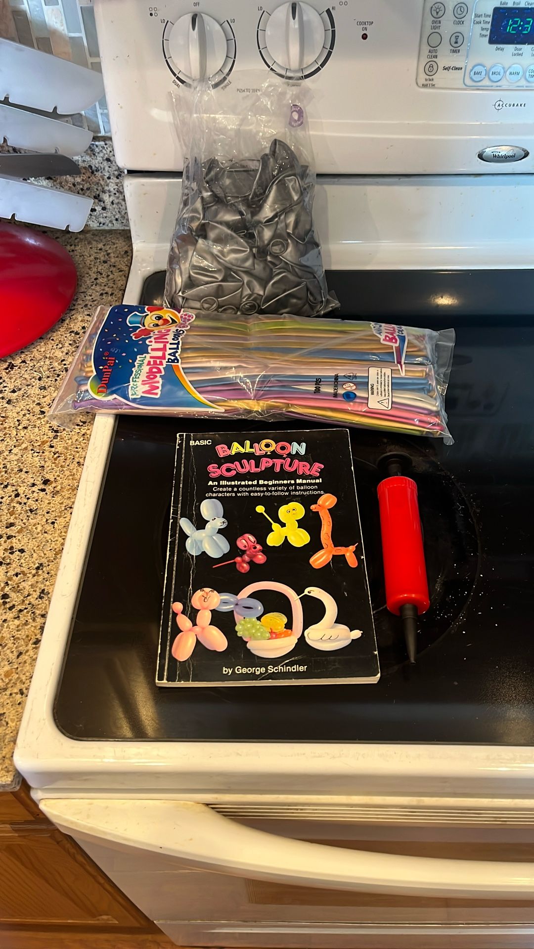 Tons of balloons, pump and book