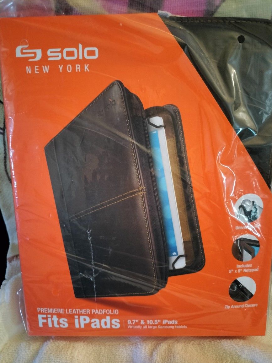 Premiere Leather Padfolio Fits ipads 9.7" and 10.5" Along Samsung Tablets Includes 5x8" notepad, slip pockets, biz card slots. Doubles as a stand