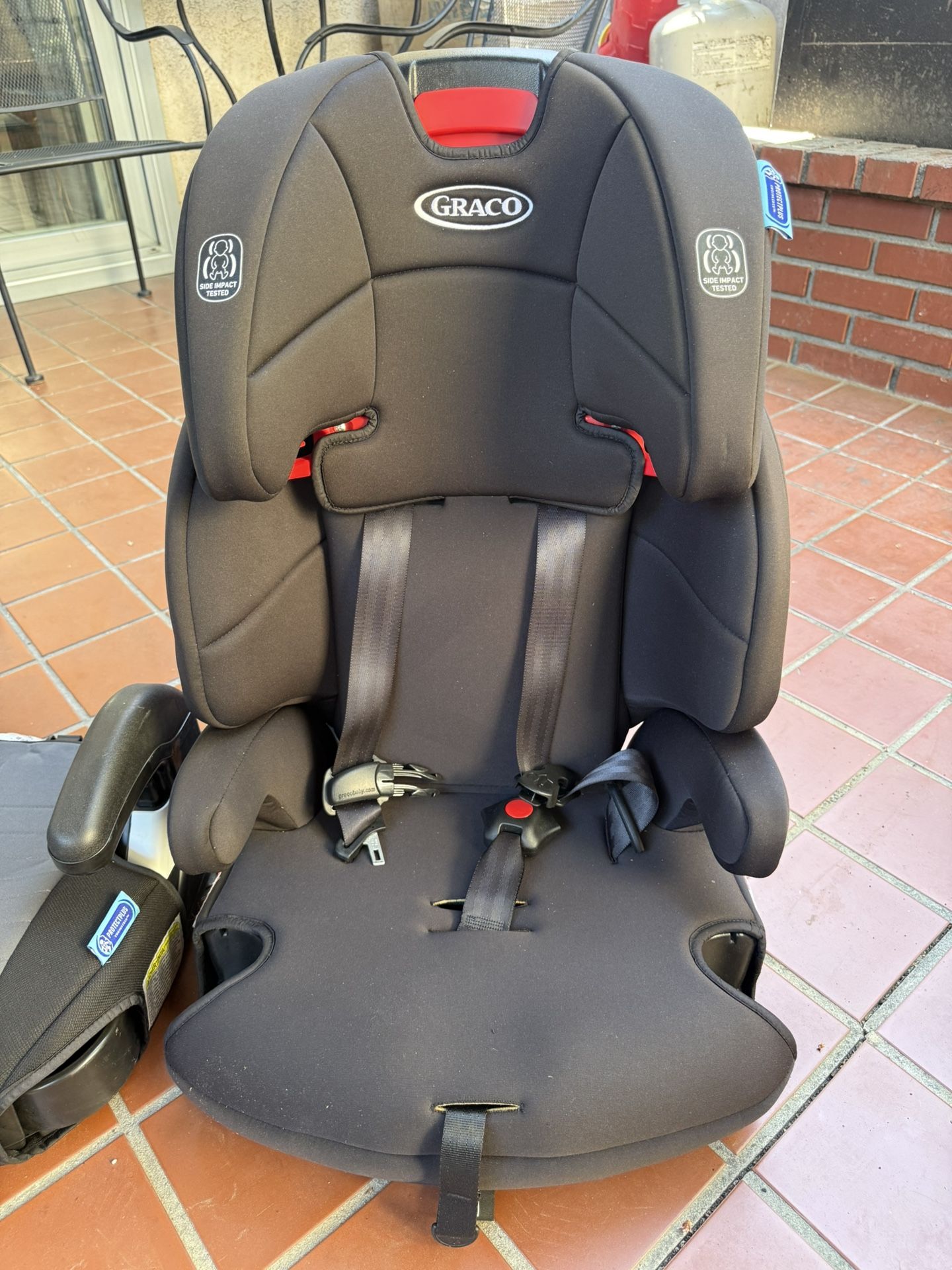 Graco 2-in-1 car seat that converts into a high-back booster and backless booster (both included). • Good used condition • Clean, no major stains or damage • Adjustable headrest and harness • Side impact protection • Includes removable back and separate booster seat • Perfect for growing kids