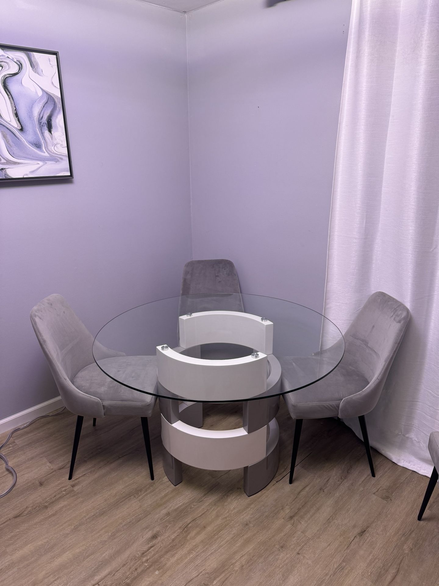 48-Inch Round 10mm Thick Tempered Glass Top. Comes with 4 chairs, light gray velvet fabric. Unique Gray and White base! Base and glass top can be disassembled for transport. 2 Chairs do have a few small bite marks from cats but no significant damage. no problems with it at all, we just don’t use it very often and would like the space instead! Delivery available for additional fee, fee depending on distance.