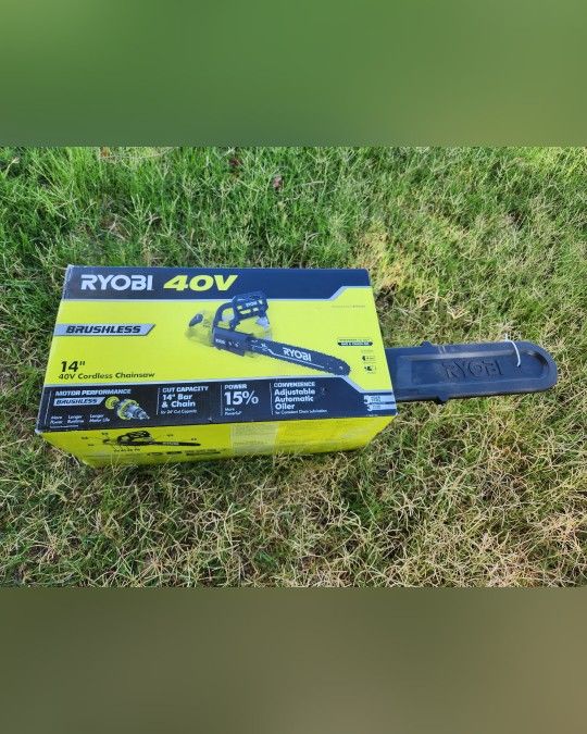 Includes a Brushless Motor for Increased Run Time and Power 14 in. Bar and Chain Optimized for Cordless Efficiency Works with all RYOBI 40V Batteries If you've wondered whether a cordless chainsaw could perform as well as gas, Ryobi has your answer. The 14 in. 40V Brushless Chainsaw includes features to make your cutting experiences just as efficient as a gas unit, with the convenience of battery powered operation. With a 4.0 Ah 40V lithium-ion battery and a brushless motor, this saw delivers the fast cutting speed and higher torque you would expect from a gas model. With features like side access chain tensioning, an adjustable automatic oiler, and on-board tool storage, you'll experience easy, comfortable operation for any clearing jobs. As part of the Ryobi 40V system, it is compatible with all 40V batteries and chargers. Best of all, the Ryobi 40V Brushless chainsaw is backed by 5-year warranty - the type of coverage usually found only with professional gas models. With all these gas-like features and power, you can trust your job to Ryobi. GAS-LIKE POWER 14 in. bar and chain Side access chain tensioning and on-board tool storage for easy adjustments Oil level indicator window Includes RYOBI 40V 4.0 Ah lithium battery Works with all RYOBI 40V lithium batteries
