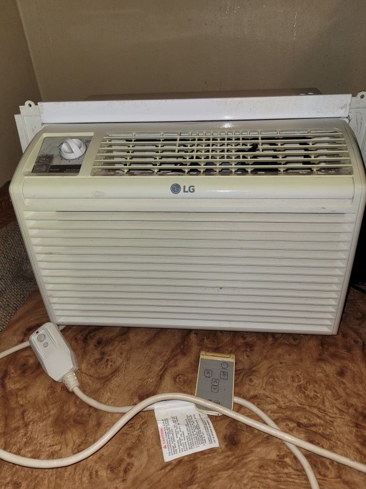 The AC is an LG window unit with a rotary knob for temperature and buttons for mode, fan, and power.