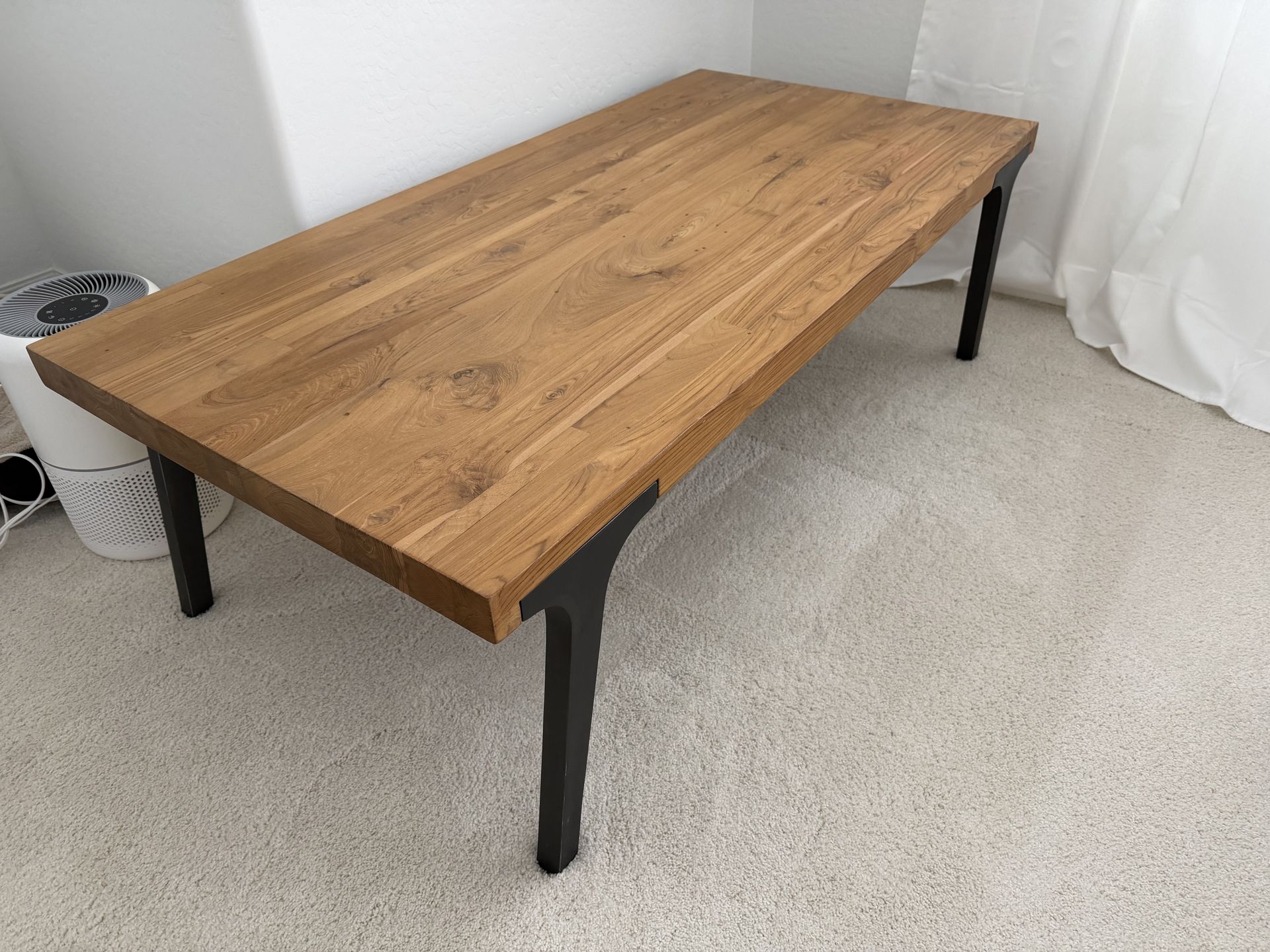 Heavy and substantial coffee table with metal legs and a teak wood top that stands up to abuse. 17”W x 26”H x 52”L Originally $899