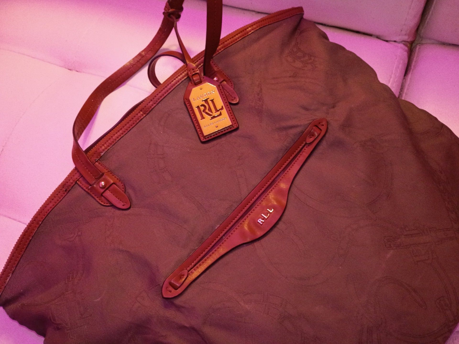 Lauren Ralph Lauren Olive Colored purse with inlay design on exterior with branded hardware. Inside hosts two zipper less pockets and one zipper pocket. Tons of room! Very large