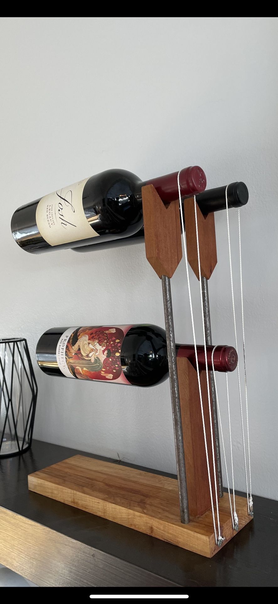 Tension wire rack gives the impression of floating wine bottles. Holds up to three and is custom made. Nothing like it in stores.