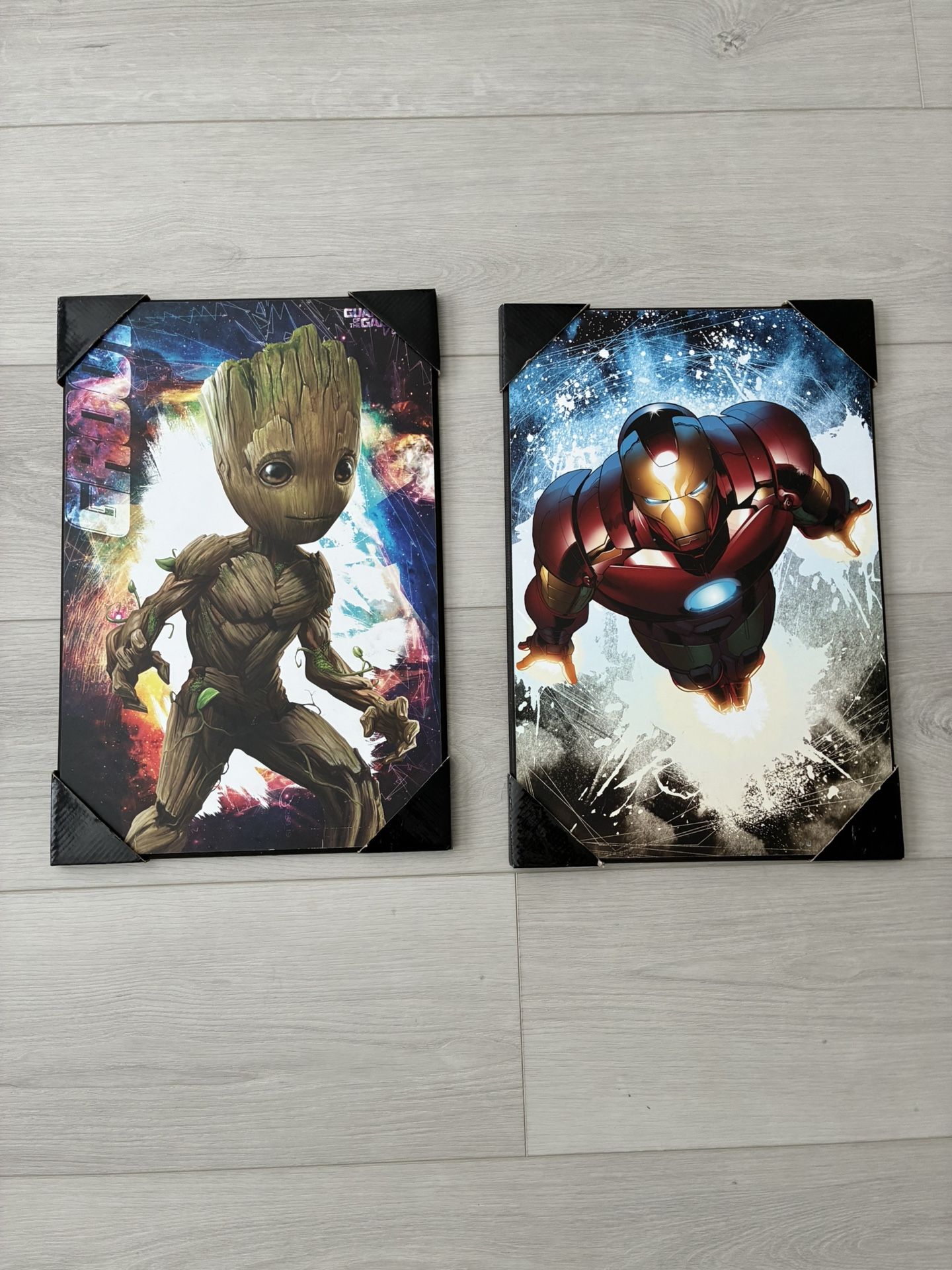 Two avenger pictures brand new Iron Man and Groot pictures with hanging attachment available. With : 13 inched across Length : 19 inches Pick up only