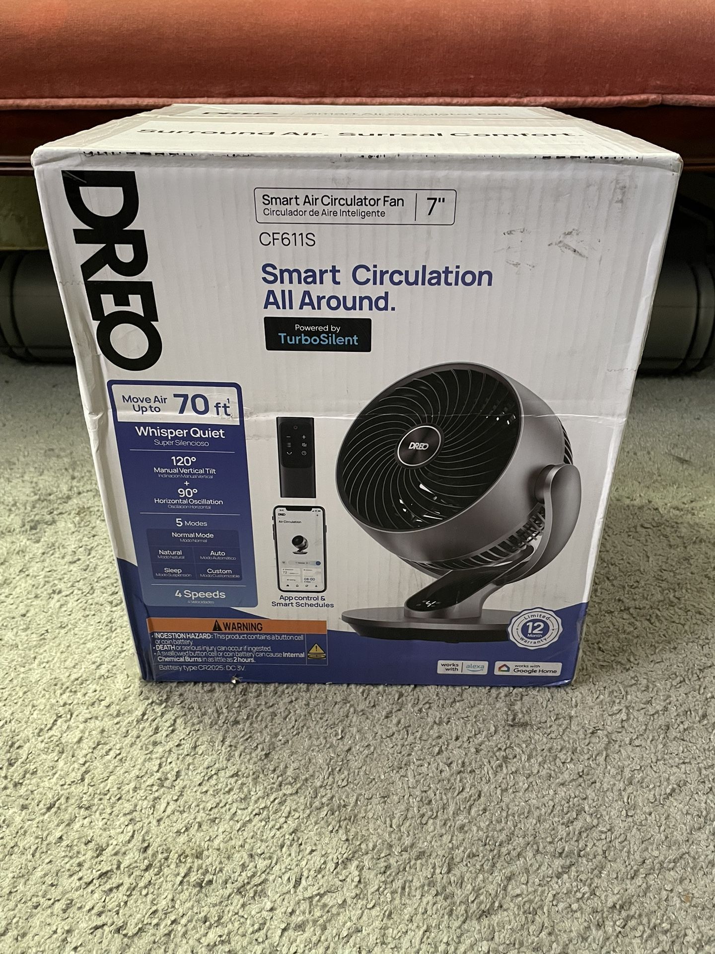 Brand new, sealed. Dreo 5 Series CF511S (see label on back of box; there is no Dreo 6 Series). Adult owned by a non-smoker. Product Details from the Manufacturer: * ๐๐ช๐ก๐ก ๐ง๐ค๐ค๐ข ๐๐๐ง ๐๐๐ง๐๐ช๐ก๐๐ฉ๐๐ค๐ฃ: Experience powerful airflow up to 70 ft with Dreo's WingBoost technology. Compact at 11.46"D x 10.24"W x 13.19"H, this 13-inch fan with 7-inch blades efficiently cools bedrooms and offices while fitting perfectly in any space * ๐พ๐ค๐ซ๐๐ง๐จ ๐๐ซ๐๐ง๐ฎ ๐จ๐ฅ๐ค๐ฉ: This oscillating fan sweeps 90ยฐ horizontally and 120ยฐ vertically, quickly eliminating stale air. Its powerful airflow keeps rooms fresh and comfortable, ensuring consistent ventilation and a refreshing atmosphere everywhere * ๐๐ฉ๐ช๐ฃ๐ฃ๐๐ฃ๐๐ก๐ฎ ๐ฆ๐ช๐๐๐ฉ: Engineered with aerodynamic bionic blades, this fan reduces noise to a whisper-quiet 28 dB. Enjoy ultra-quiet, soothing airflow all day, creating a peaceful and comfortable environment for your entire family * ๐๐ข๐๐ง๐ฉ ๐๐ค๐ฃ๐ฉ๐ง๐ค๐ก ๐ง๐๐๐๐ฎ: Control airflow effortlessly with 5 wind modes and 4 speeds via the Dreo app, voice commands, Alexa, or Google Assistant. Enjoy seamless smart control tailored to your needs for ultimate convenience * ๐๐ค๐ง๐ ๐ฉ๐๐๐ฃ ๐๐ช๐จ๐ฉ ๐๐ฃ ๐๐๐ง ๐๐๐ง๐๐ช๐ก๐๐ฉ๐ค๐ง: This portable fan delivers gentle breezes or strong airflows, ensuring whole-room freshness and comfort. Perfect for bedrooms, offices, and living spaces, it guarantees a cool and revitalizing atmosphere wherever you need it