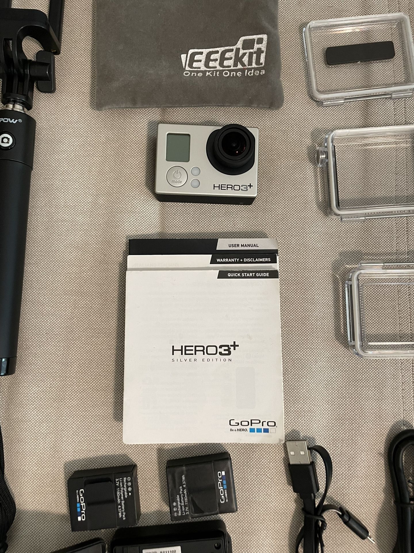 GoPro Hero3+ Silver and bundle of accessories including sticks, head attachment, chest attachment, extra batteries, underwater housing, suction mount and more. This has hardly been used!