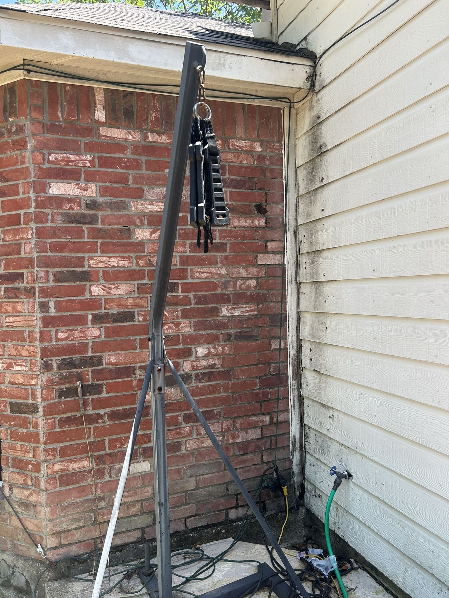 Bag is about 100 lbs but tore off from stand. Stand is heavy but in great condition. Good for training or losing weight. You will need 2 or 3 people to lift and take. May need a truck.