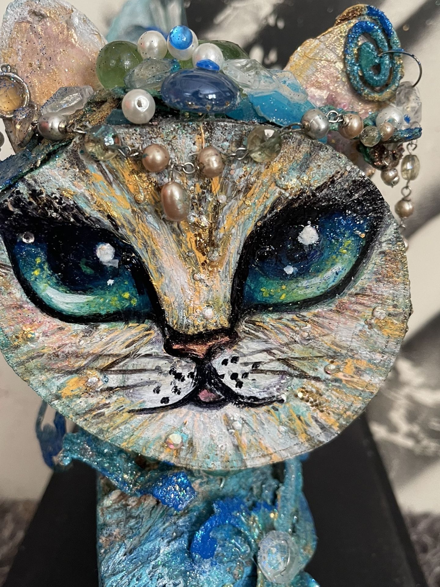 Handmade and painted beautiful wood cat sculpture made from reclaimed wood and has glass beads, rhinestone s , and vintage jewelry pieces. One of a kind.