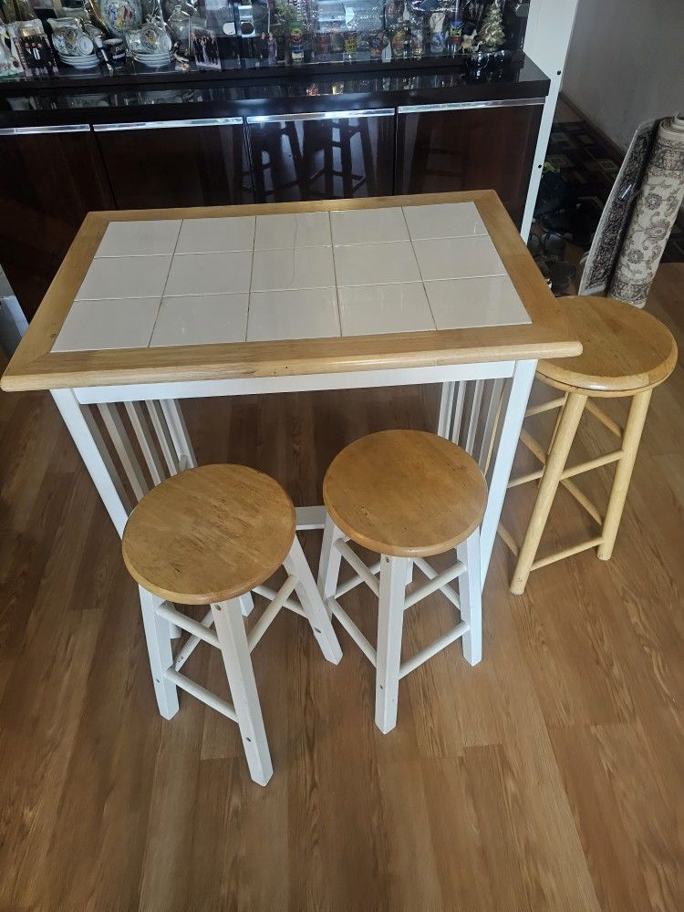 - Bar Table comes w/3 bar Stools (1 High chair). - Material is hardwood w/ceramic tile on top. - Price is negotiable. - Cash Only. - All sales are final. -Pick up only.