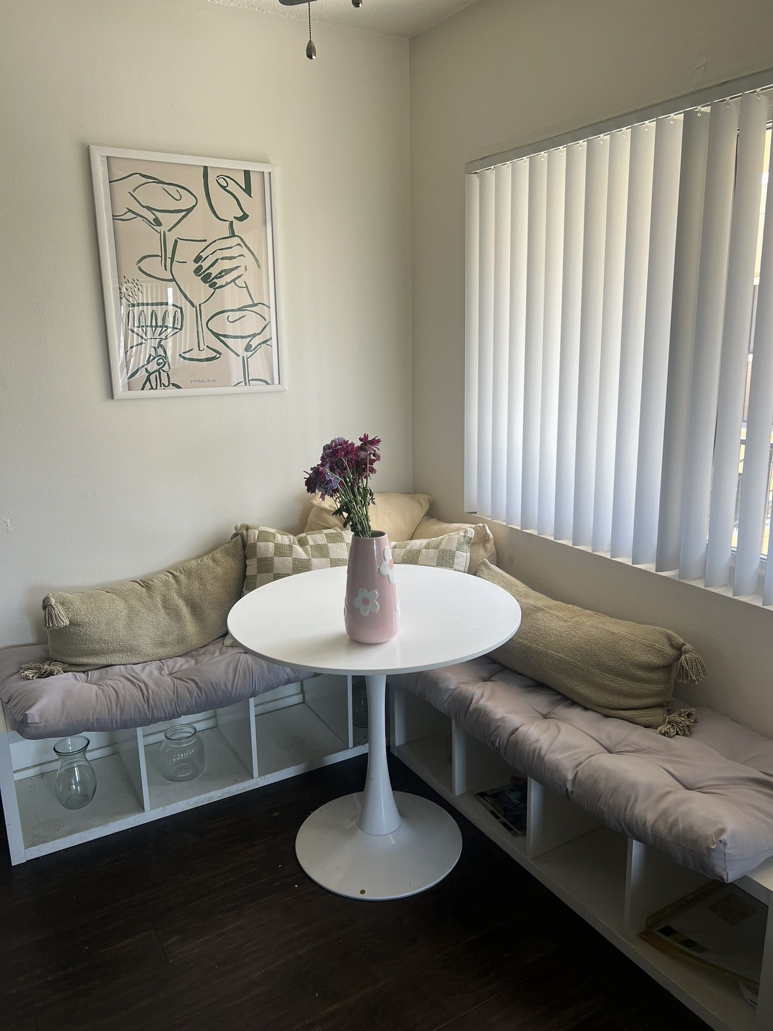 57 1/2 in x 15 1/2 in for the bench 31 1/2 in width for table 2 ikea bookshelves to make a corner nook. Selling a the nook and table for $100. Pick up in PB before July 1