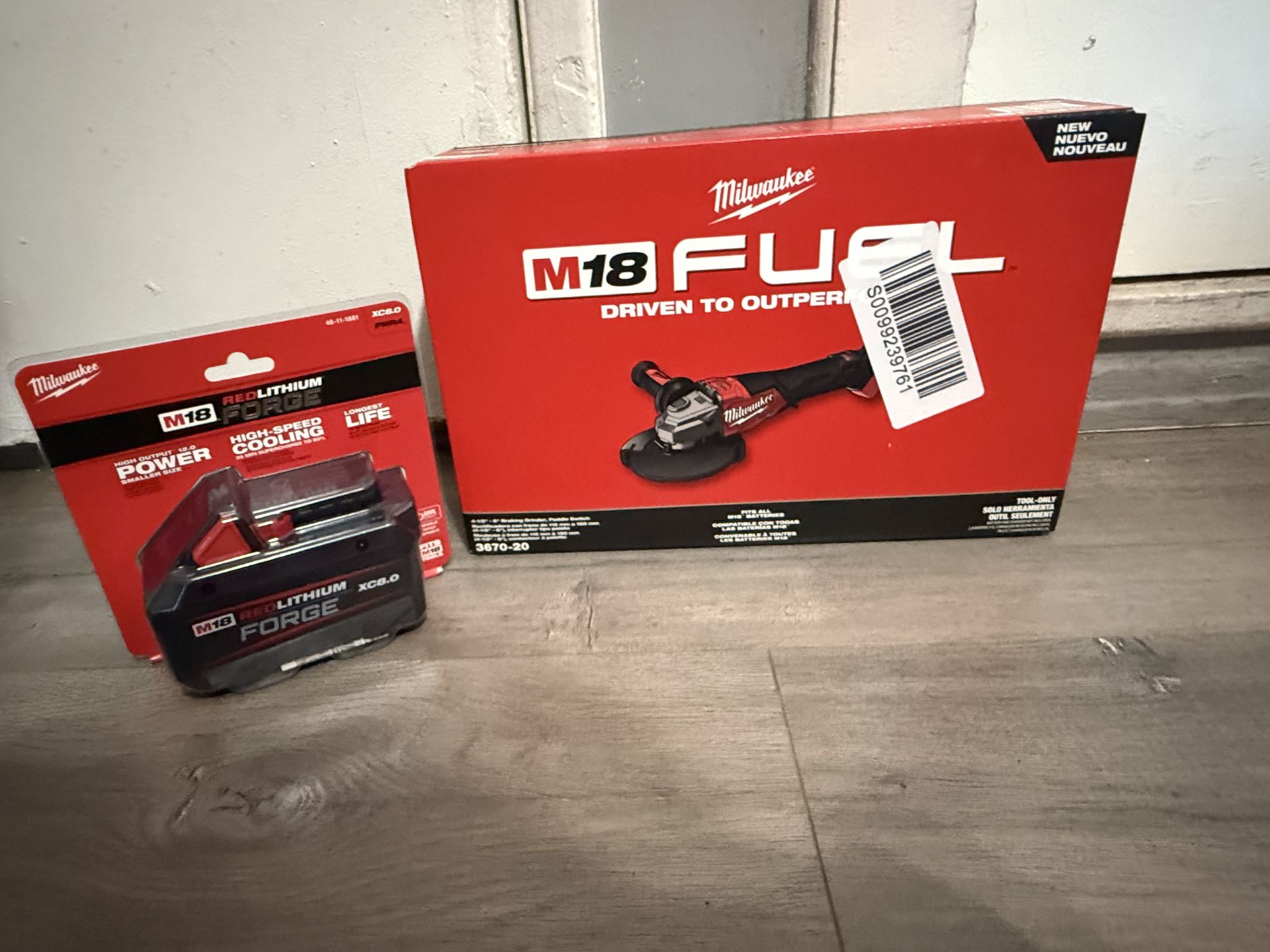 Brand New Sealed Milwaukee Grinder With 8.0 Ah Forge Battery Model 3670-20 Fits 4 1/2 Blade - 6 Inch Blade Retail Price at home depot Is $279 Plus Tax and for the 8.0 forge battery is $229 plus tax still has warranty and you can feel free to test before purchasing no low ballers