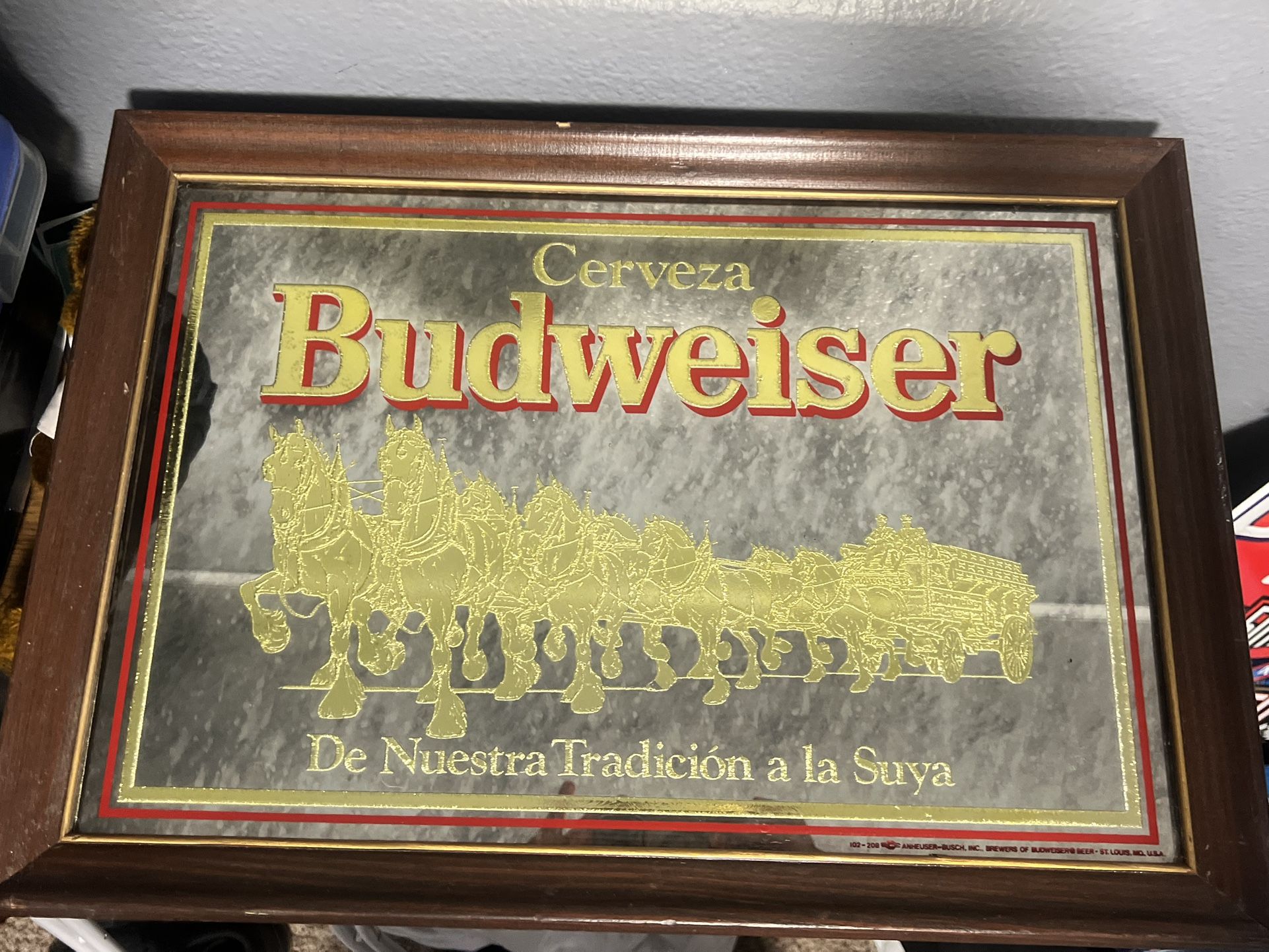 Vintage 1986 Cerveza Budweiser Spanish Bar Mirror with Clydesdale