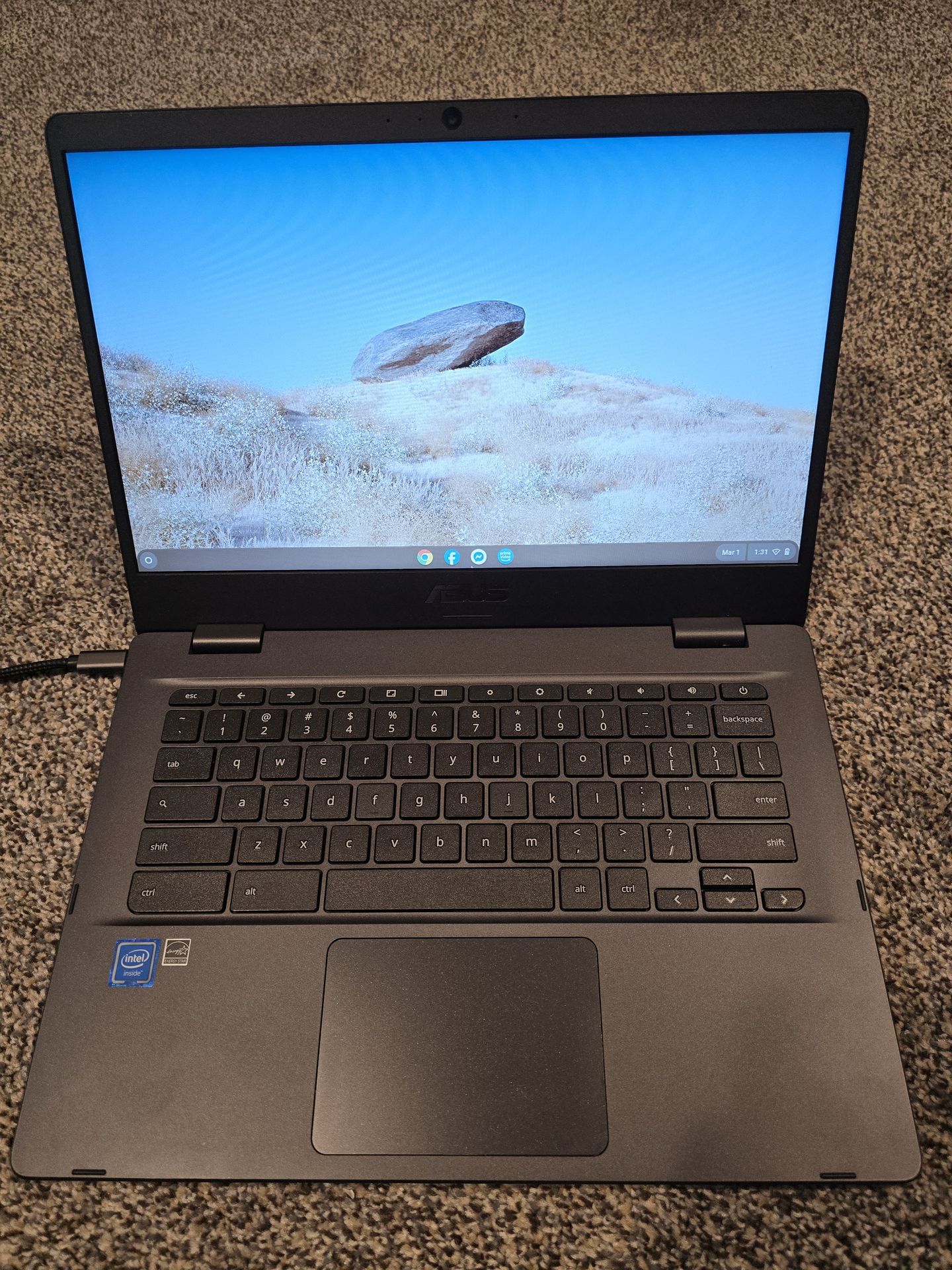 ASUS Chromebook C423N. 14 inch screen. Intel Celeron N3350 Processor, 4GB DDR4 RAM, 128GB eMMC. Built in camera. Bluetooth. In great condition & two power cords. $100.