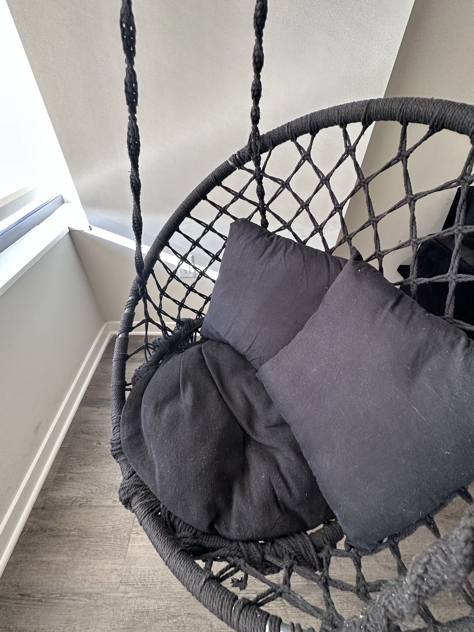 A plush black indoor hammock swing w/ chain and ceiling anchor