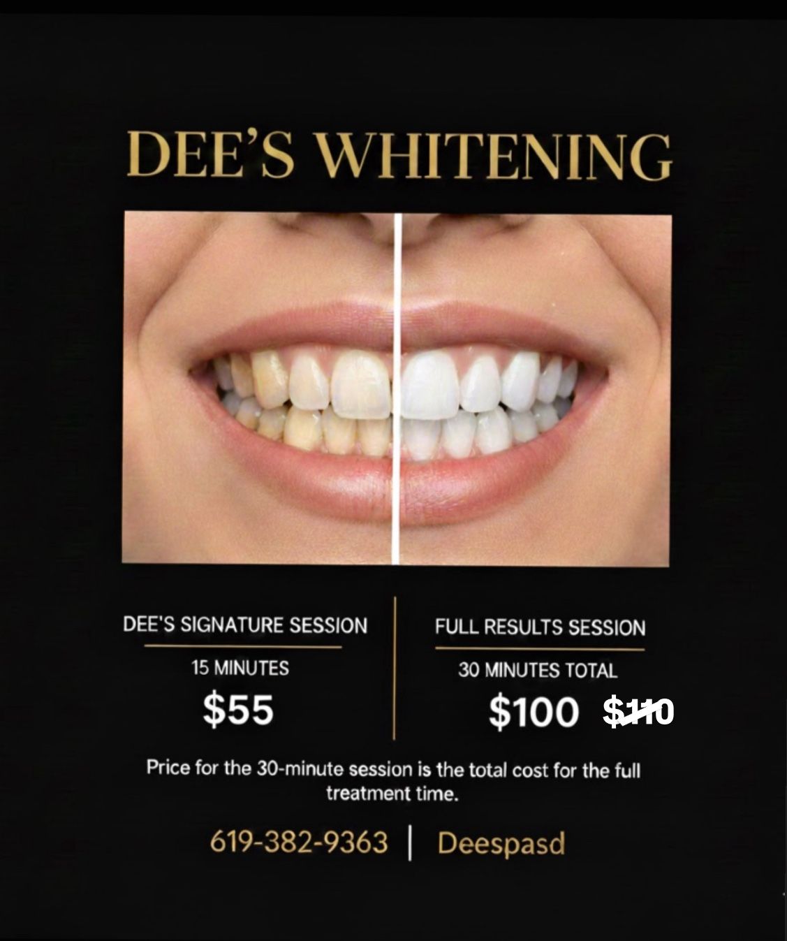 Polished. Refined. Effortless. ✨ Professional teeth whitening at Dee’s Spa—designed for natural-looking brightness in just 15–30 minutes. Enamel-safe • Low sensitivity • Same-day results Book when you’re ready 💎