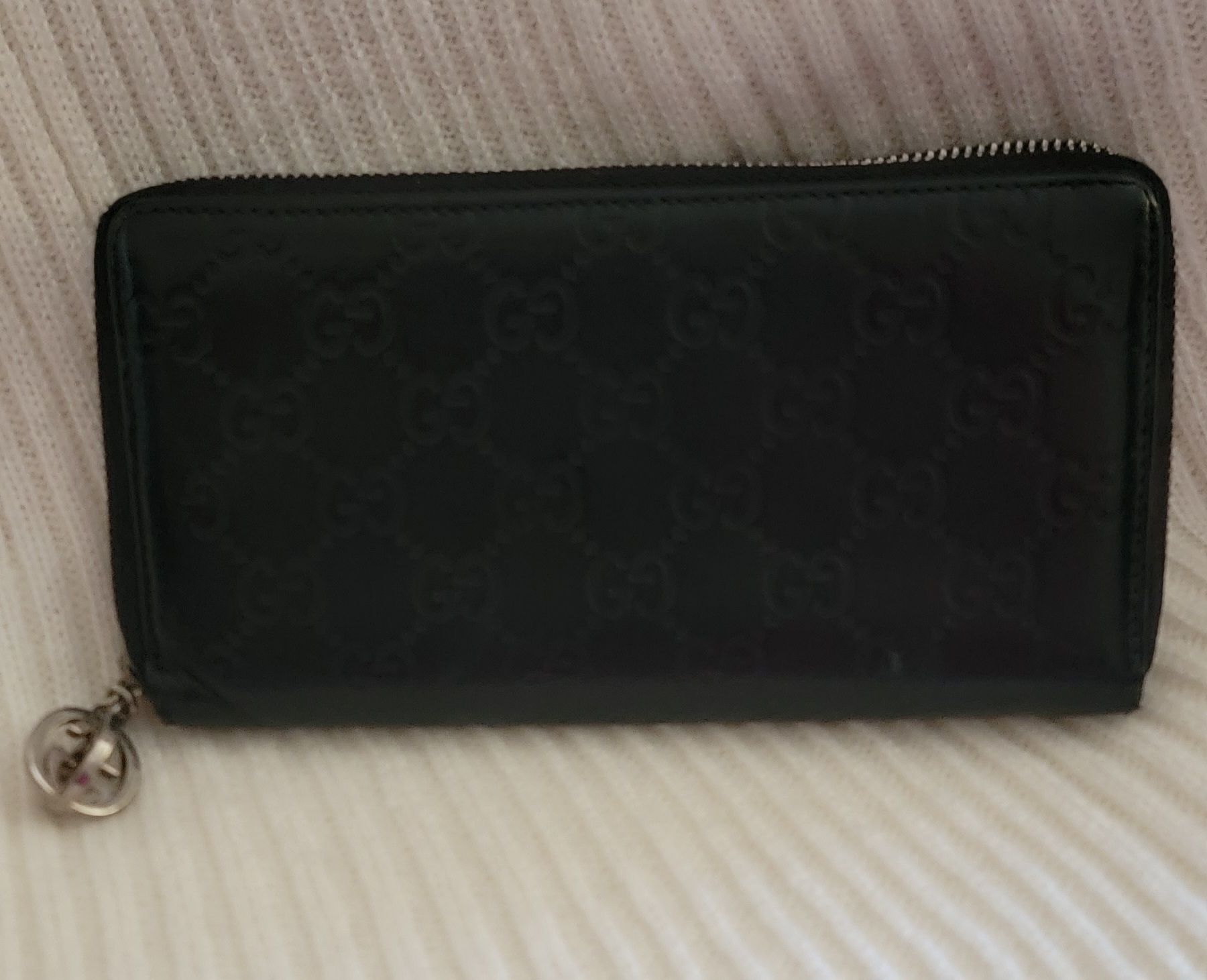Design: Crafted from black Guccissima leather, which features the iconic interlocking GG monogram embossed throughout. Features: It typically includes a silver-tone or gold-tone zip-around closure. The specific model in the image features a unique Interlocking G motif zipper pull. Interior: Generally contains 12 card slots, three bill compartments, and one zip closure coin pocket. Dimensions: Approximately 7.5" L x 4" H x 0.8" W.
