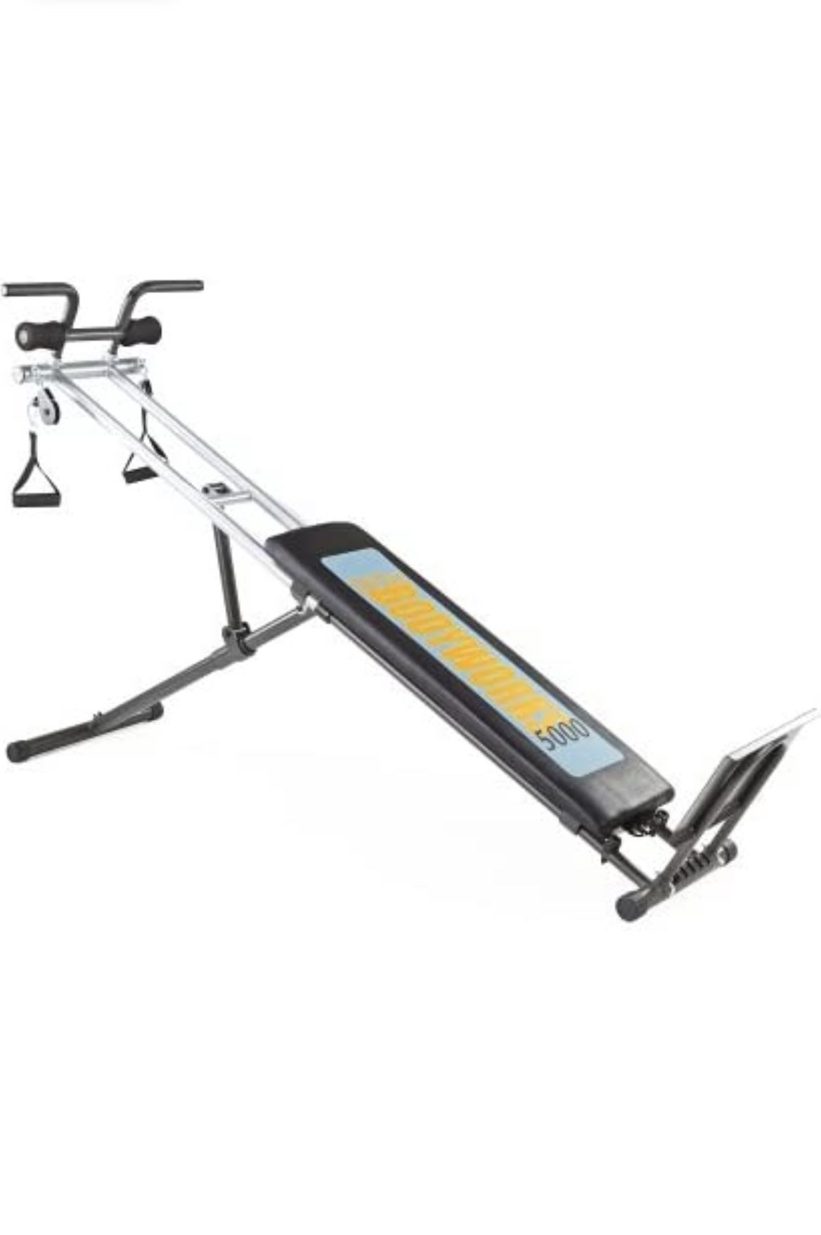 This listing is for a Weider Total Body Works 5000. Full body gym, offers over 50 body shaping exercises that strengthen and build muscle flexibility. Four adjustable power bands for up to 50lbs of additional resistance. Unrestricted cable and pulley system provides versatility and great range of motion. Space saving design with convenient slide away technology for quick and easy storage. Easily increase or decrease the intensity of your workout by simply changing the incline of the body works glide board, giving you 7 easy to change incline options. Equipment has minor wear, in great condition selling as is. You pickup!