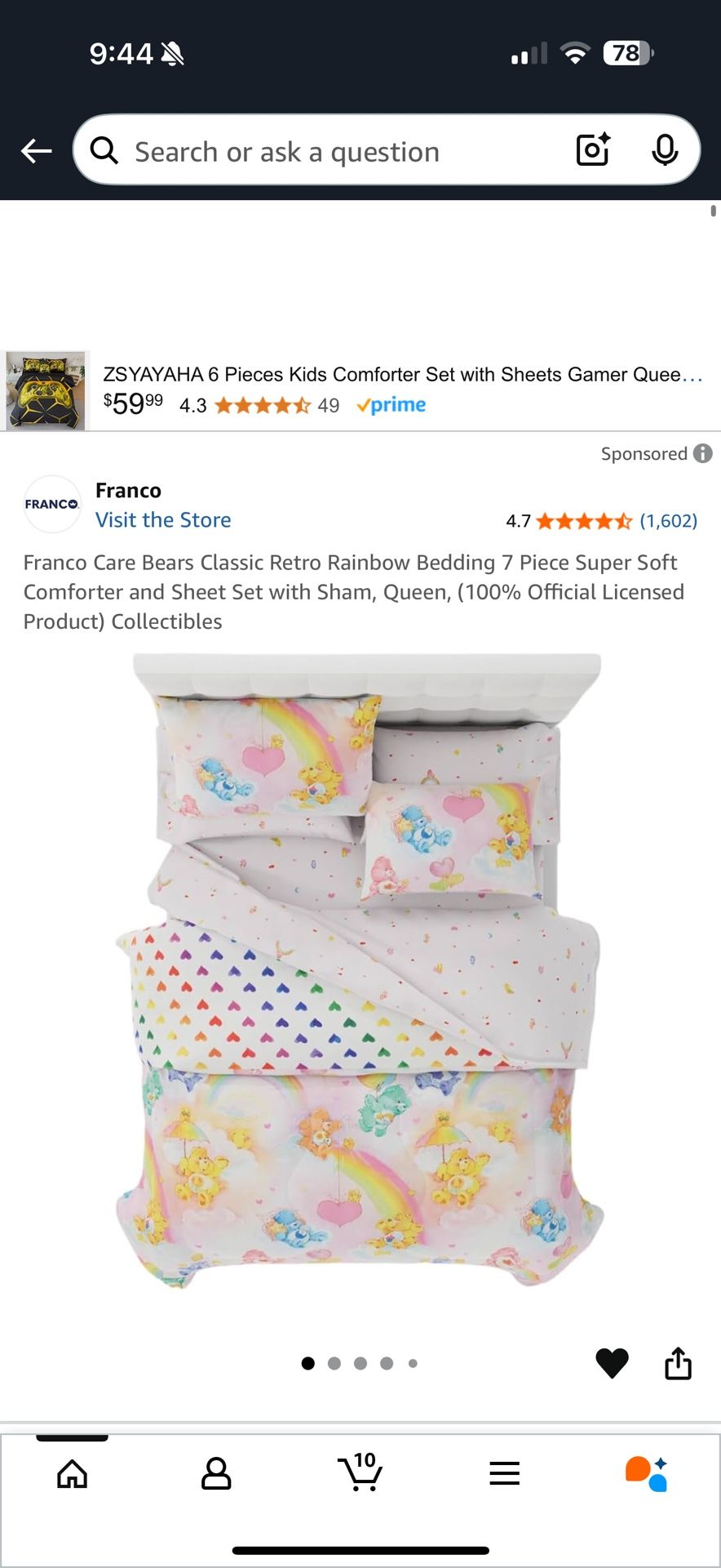 Brand new Care Bears Classic Retro Rainbow Bedding 7 Piece Super Soft Comforter and Sheet Set with Sham, Queen Size Size 7 Piece Queen Size Included Components 2 Shams, 2 Pillowcases, Comforter, Fitted Sheet, Flat Sheet Color Yellow - Care Bears 100% Microfiber 7 PIECE QUEEN SIZE COMPLETE LINEN SET INCLUDES: 1 fitted sheet 60" (W) x 80" (L) 1 flat sheet 90" (W) x 102". (L) 2 standard pillow cases 20" x 30". 2 pillow shams 26" x 20". 1 reversible comforter 86" (W) x 86" (L). Designed to fit a standard queen size bed. SUPER SOFT EASY CARE BED IN A BAG: Crafted for comfort, the microfiber material is super soft and long lasting, keeping you warm and cozy all night or while camping. You can throw the bed sheets and comforter into the washer and dryer without worrying about the colorful themed pattern and animated cartoon characters fading or the need for ironing. The material is wrinkle-resistant, making it a great choice for any collector's bedroom or as a home decor accessory. TWO DESIGNS IN ONE COMFORTER: The Care Bears gang is enjoying some rainbow fun on the front of this versatile reversible comforter. When it’s time for a new look, simply flip it over to reveal an eye catching multicolour heart pattern on the other side.
