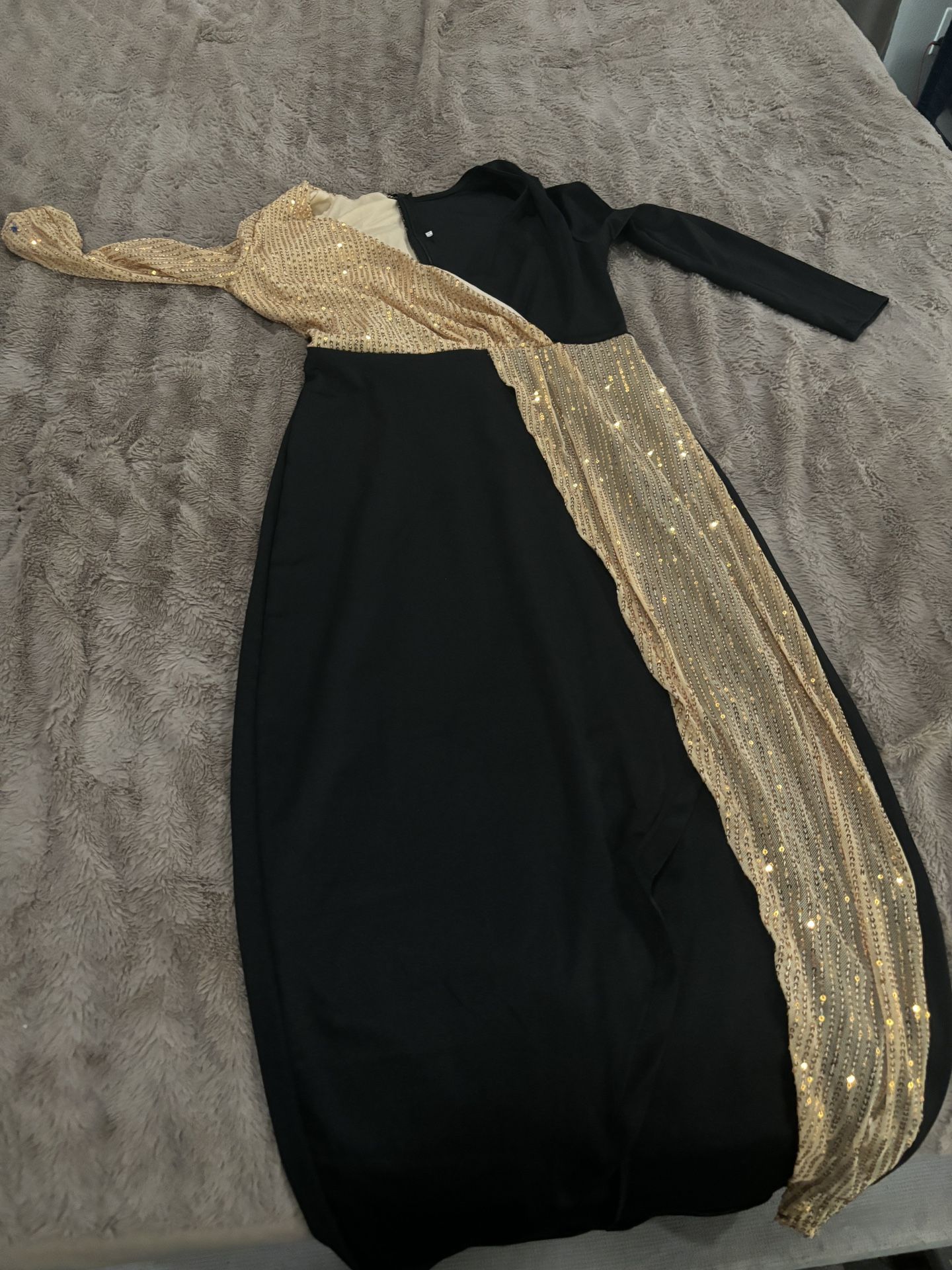 Black and gold dressed brand new size m I ordered the dress it was showing to much cleavage for me but brand new