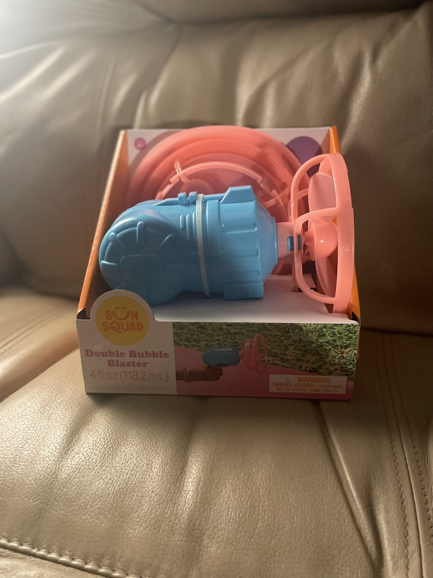 Enjoy endless fun with the Double Bubble Blaster. This vibrant blue and pink toy is perfect for outdoor play. Its sunsquad brand. Its new in package.