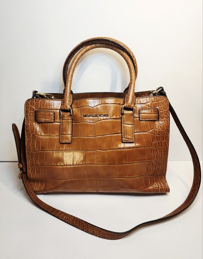 This is a classic and modern croc embossed satchel bag by Michael Kors. Accented with gleaming signature lettering, the adjustable strap offers extra portability. Color: Walnut Croc embossed leather. Double handles with 4-1/2 drop; adjustable strap with 17-1/2 -19-1/2 drop. Gold plated feet on the bottom of the bag. Interior features 1 center zip compartment, 3 open pockets, 1 zip pocket, and 1 key fob clip. Measurements: 12-1/2 W x 9-1/2 H x 4-1/2 D. Elevate your style with this Michael Kors brown crocodile-embossed bag. Perfect for any occasion, this elegant accessory combines luxury and functionality. This bag is in excellent used condition, like new!! Only gently used a couple of times. No stains or defects. Very clean and has been sanitized.
