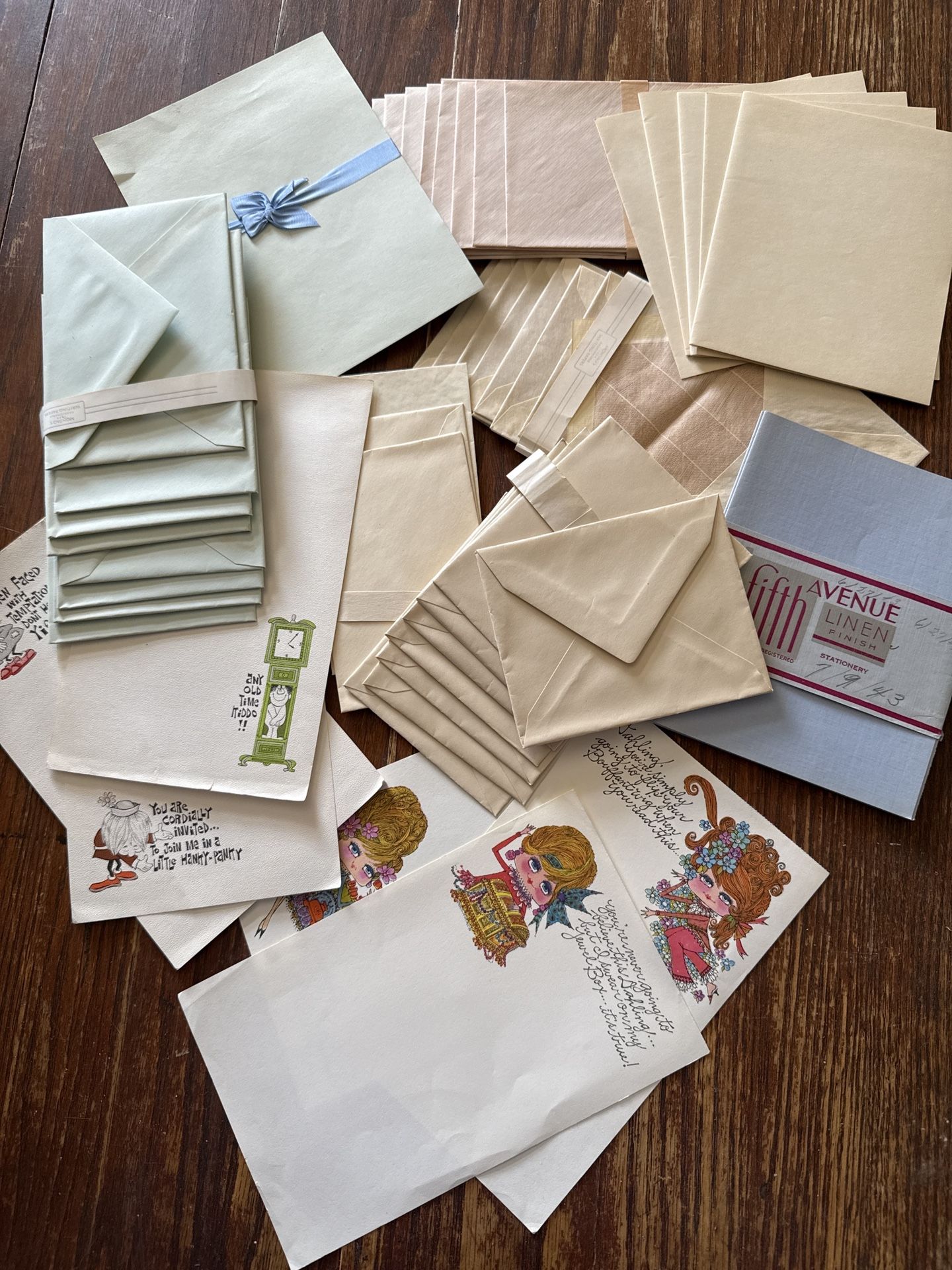 Assorted vintage stationery collection from the 1960s–70s. Includes linen writing paper, unopened envelopes, and fun illustrated note sheets/cards. Perfect for collectors, journaling, scrapbooking, or letter writing. unused and in excellent condition. Selling as a lot. $45 OBO.”