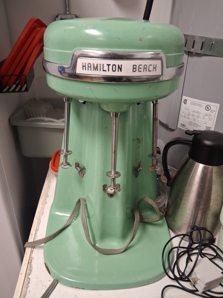 It features three spindles for mixing multiple drinks simultaneously. The mixer has a heavy-duty die-cast body with porcelain enamel finish. It operates with three speeds for versatile mixing options. Beutifuk Jadeite color. Its been collecting dust and time to give it a new home.