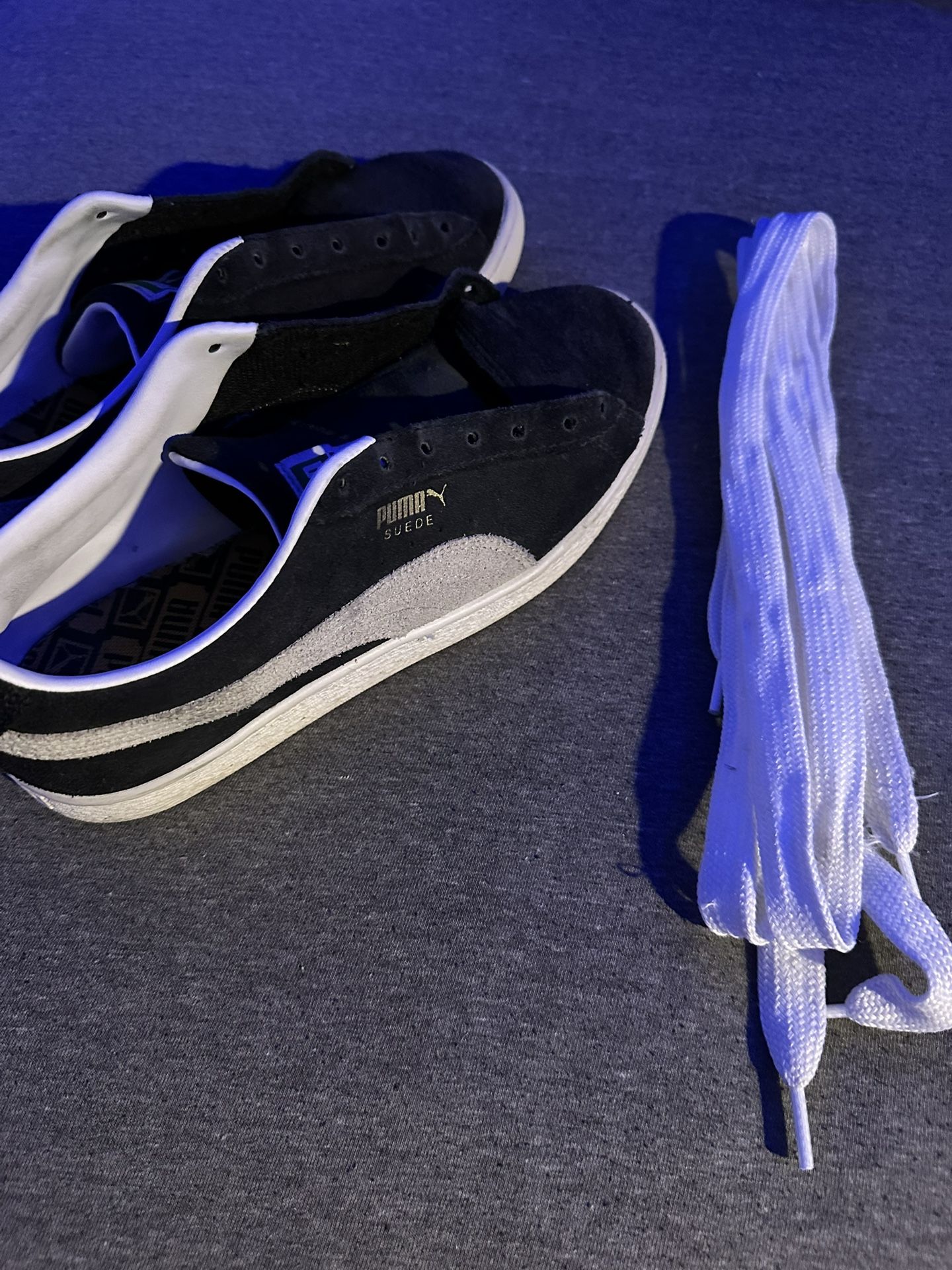 Black and white color Puma suede shoes Used but very good condition $35 Comes with the original white chunky laces Size 8 men’s
