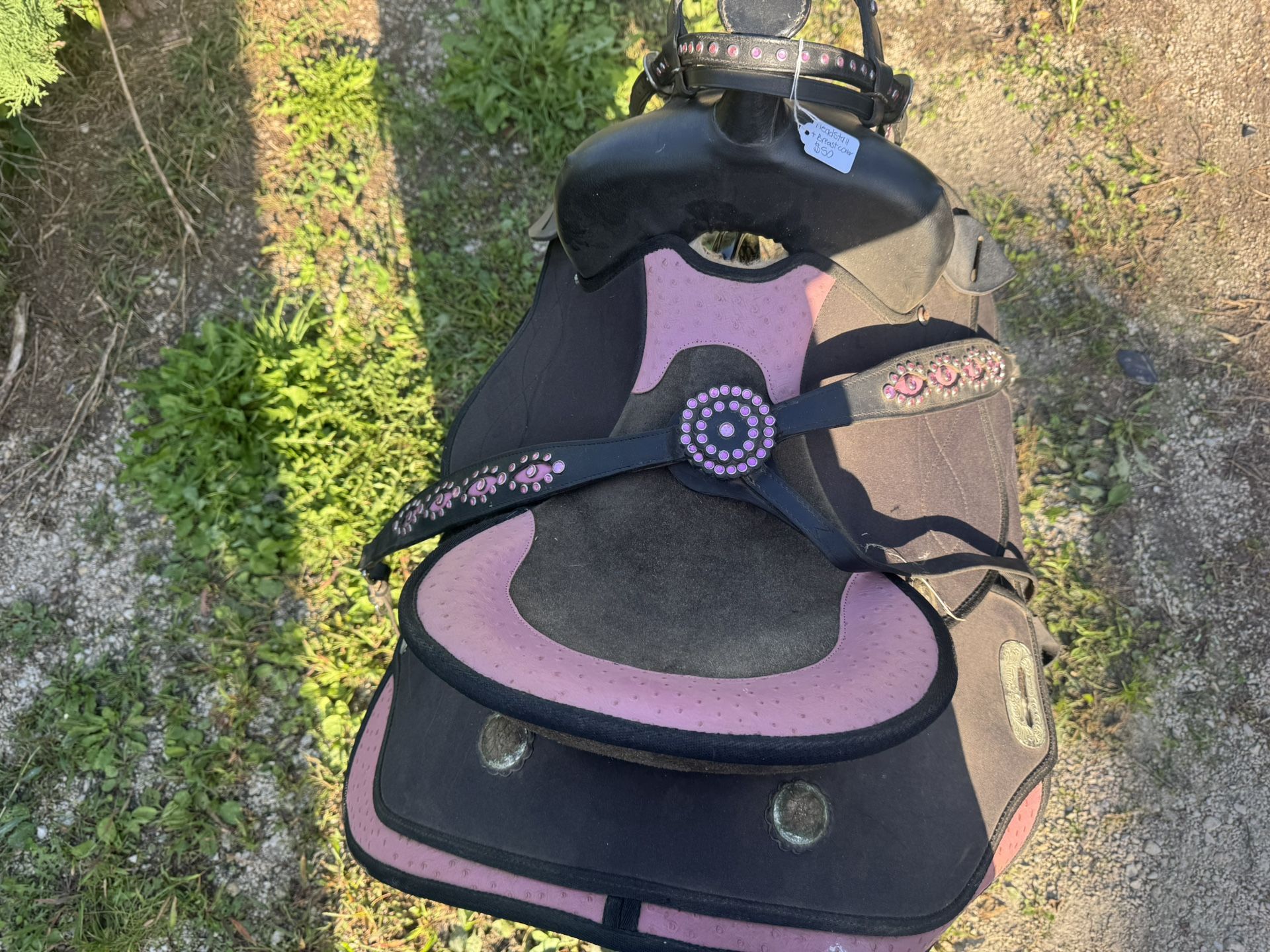 Flashy & Lightweight! Pink & Black Western Trail Saddle - 16" Seat comes with breast collar and head stall Turn heads on the trail or in the arena with this fun, vibrant Western saddle! This saddle features a lightweight synthetic/cordura material that makes it easy to lift and handle, perfect for younger riders, smaller horses, or for taking on and off often. Key Features: • Color: Bold Pink and Black • Seat: Comfortable 16-inch padded seat with pink contrasting ostrich-print accents (or similar texture). • Bling Accents: Decorated with eye-catching pink and silver crystals/rhinestones on the horn, cantle, and accessory straps for a touch of sparkle. • Comfort: Includes a padded, soft suede-like seat area for grip and comfort. • Lightweight: Easy to manage, ideal for trail riding or as a pleasure saddle. Get ready to sparkle on your next ride!
