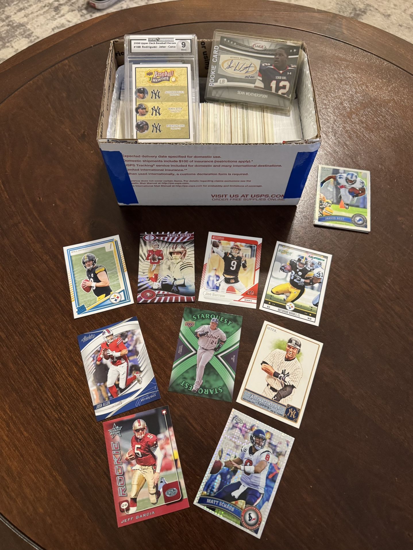 Lot of baseball & football cards. MLB & NFL. Includes hundreds of Rookie Cards, RC, inserts, & veteran base cards. Joe Burrow, Josh Allen, Derek Jeter, & many more!
