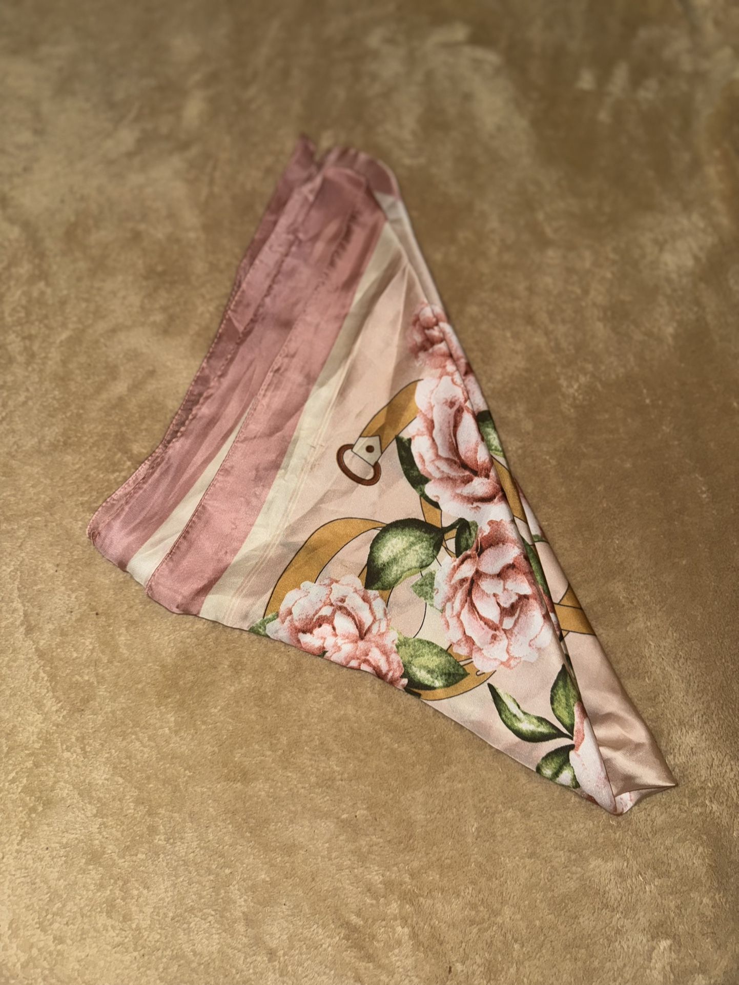 A romantic silk-feel square scarf featuring blooming blush roses wrapped in baroque-inspired gold belt accents. Timeless, ultra-feminine, and perfect as a headscarf, neck tie, or handbag accent. The print gives vintage luxury, editorial fantasy, and femme wealth goddess in every fold. FemmeEstate brings you rare pieces with taste. One of one. Material: Satin Polyester Care: Hand wash cold / Lay flat to dry Ships folded with care from a smoke-free space.