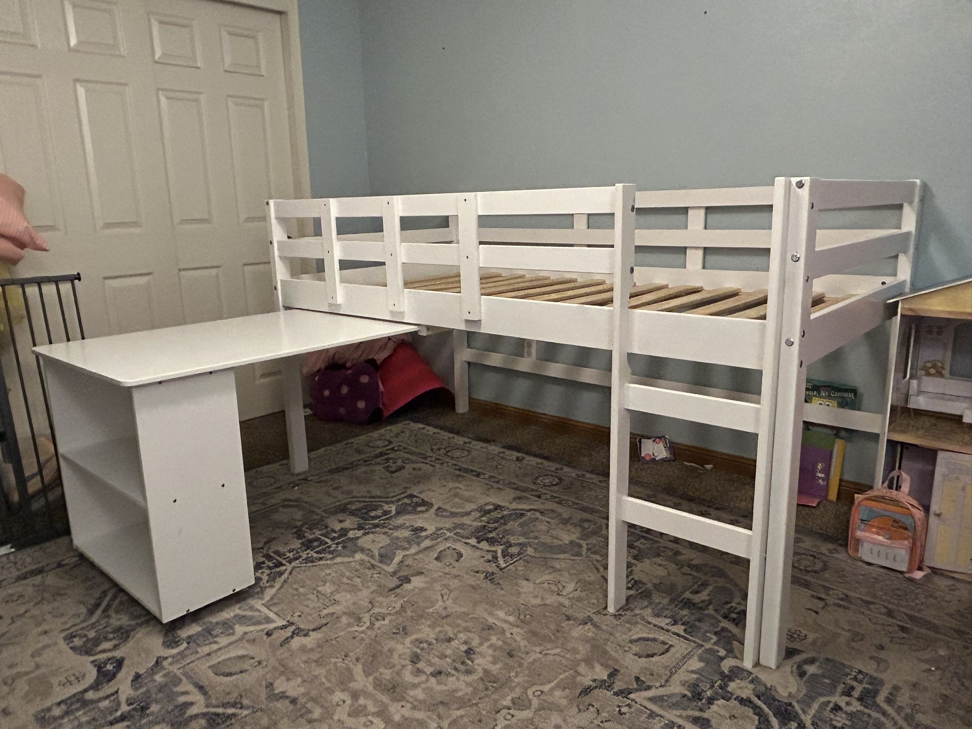 White twin loft bed with desk and mattress. In good condition. Asking $100 obo.