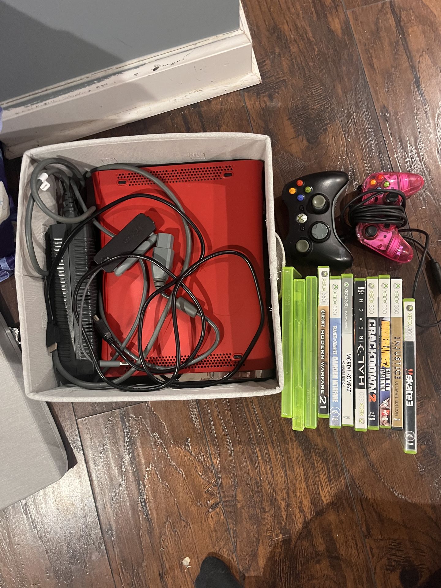 Red Xbox 360 Cables included Everything works on thing is sometimes the door get stuck so a light tap will open it. It just needs oil and it will fix the issue 11 games Everything tested 1 wired controller 1 wireless Any questions feel free to ask Offers accepted