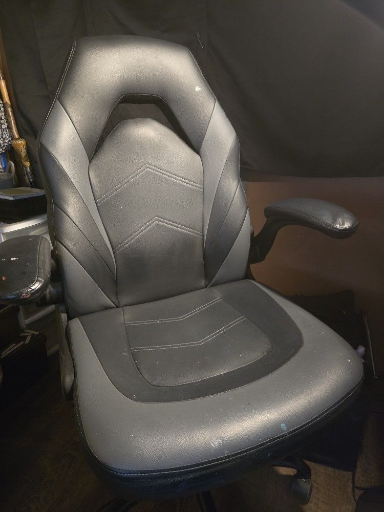 Gray & Black Rolling Desk Chair/Gamers Chair..... Very comfortable..... I've fallen asleep in it and wake up hours later, not hurting at all.... Lumbar support.... Adjustable height..... The spots you see is Acrylic Paint so I'm sure there's something that will take it off, (I haven't tried)..... One small 3/4 to 1 inch tearing back left.