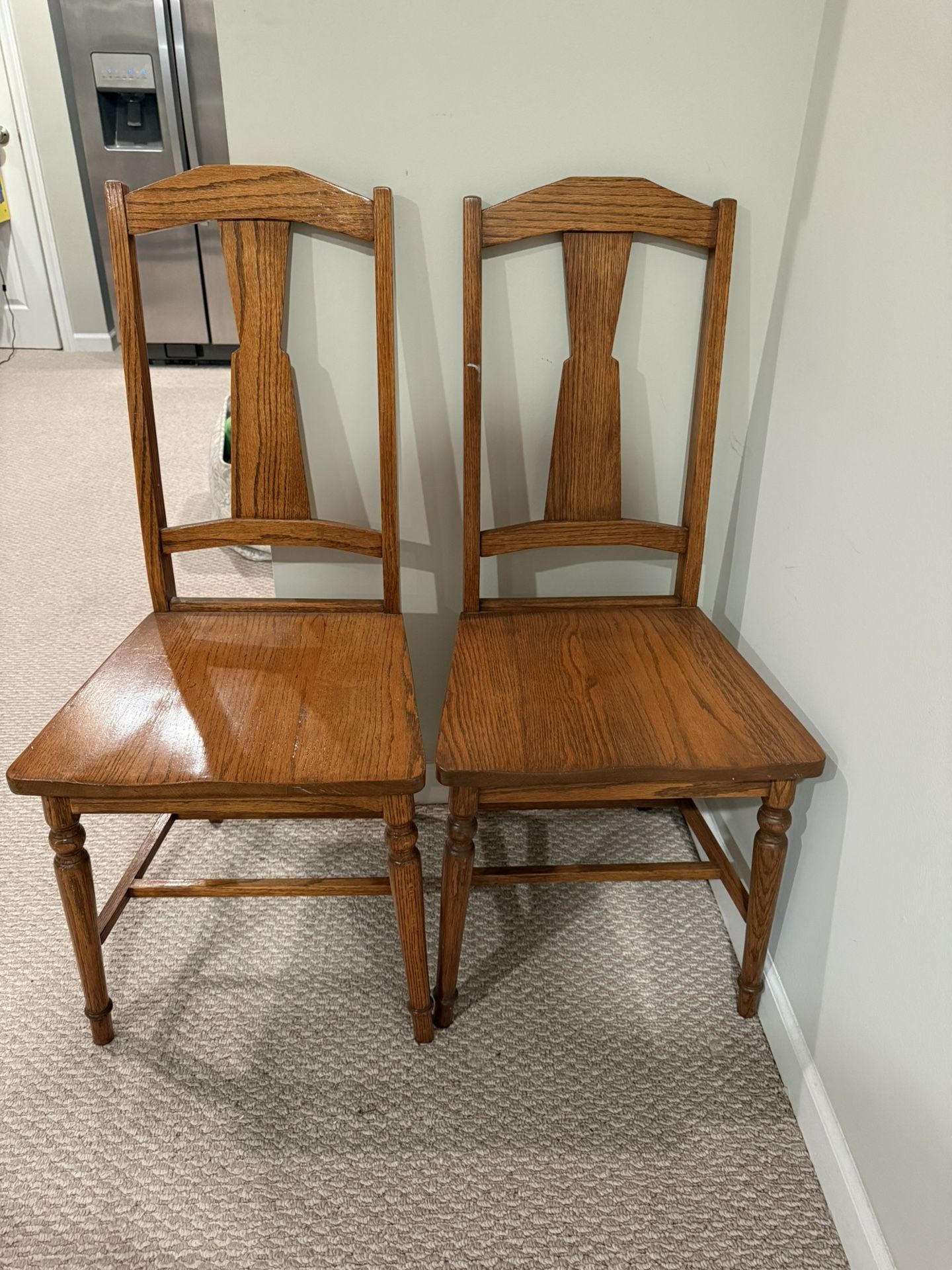 Solid oak dining chairs sold as a matching pair. Classic farmhouse/traditional design with solid wood seats and sturdy construction. Chairs are unmarked and well-built, very solid and stable, with normal surface wear consistent with age. Seat height measures approximately 17.75” from floor to seat, with an overall height of approximately 37.3”. Ideal for a dining table, kitchen nook, or as accent chairs. Sold as a pair. Local pickup only. Asking $95 for the pair or best offer. Priority to first pickup. Please comment or message with any questions!