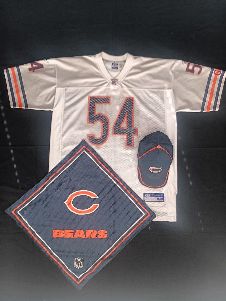 Chicago Bears / Reebok No. 54 Road Jersey Adult XL Piping, Numbers and Letters Screenprinted on Polyester. Chicago Bears / Reebok On-Field Headwear Adult L/XL Elastic Band Chicago Bears Handkerchief Polyester 21"X21" 1st come, 1st serve, cash only, pick up only. Ready for puchase in Elgin in the Providence neighborbood. ( Longcommon Pkway & Gansett Pkwy )
