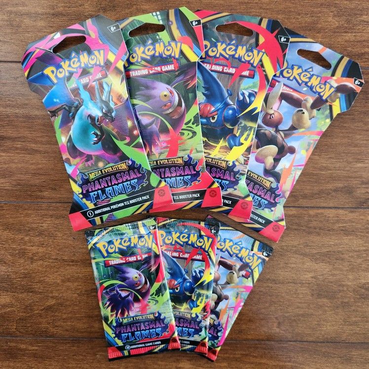 Ignite a Burning Spirit of Battle! Searing blue flames rip across a dark battlefield as Mega Charizard X ex soars up and looks down upon its opponents! With a deep chill to rival the heat, the shadowy figure of Mega Gengar ex slowly rises into view, and both Pokémon prepare to attack. Determined to prove their mettle, Mega Heracross ex, Mega Lopunny ex, and even more Pokémon line up to give it their all in the Pokémon TCG: Mega Evolution-Phantasmal Flames expansion! Each Phantasmal Flames sleeved booster pack contains 10 random cards.