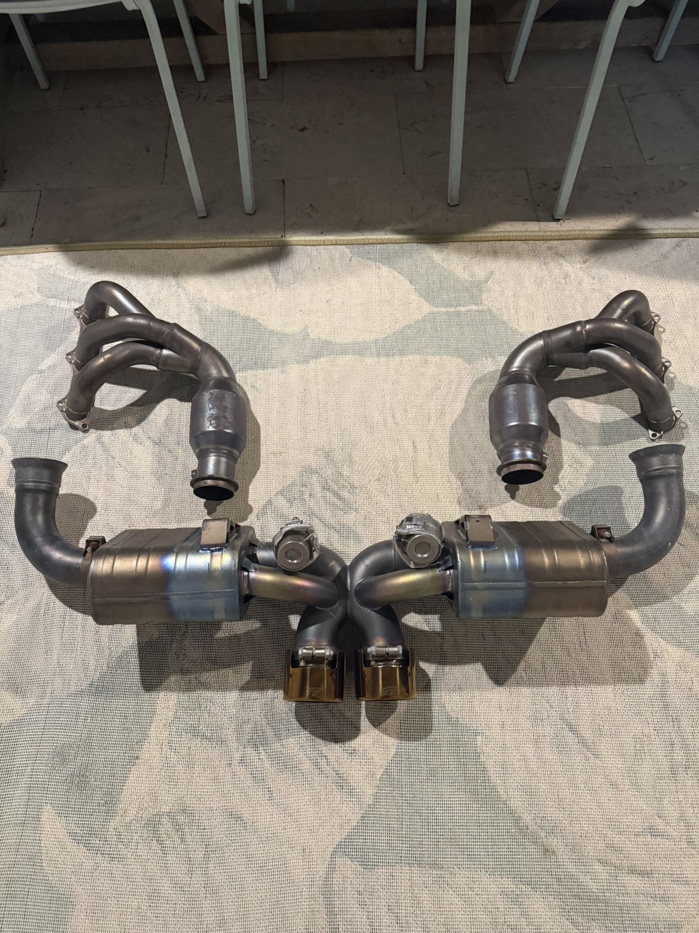 Selling a full IPE titanium exhaust system for 991 GT3/GT3RS. It was on my 2016 GT3RS for about 2k miles - I sold the car. Comes with titanium valved cat back exhaust system (gold tips) and IPE headers with 200cel sport cats. No check engine lights, no tune needed.