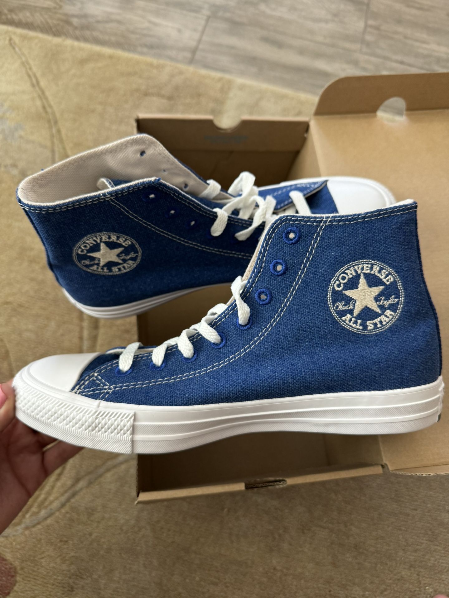 Brand new never worn! No defects. Unique one of a kind style. Denim style high top converse Can be dressed up or down. Lightweight converse. Cotton and recycled materials. “Converse renew” Unisex! Men’s 7, women’s 9 Cash & pick up preferred.